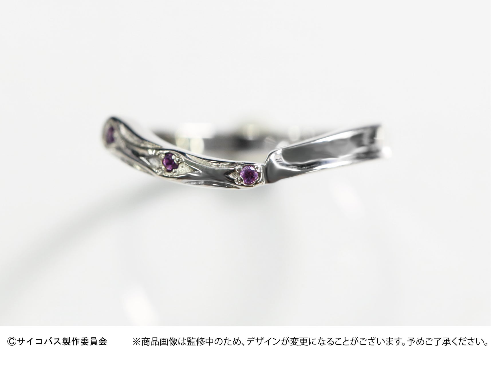 槙島が愛用している旧式の剃刀を、忠実にデザインに落とし込んだリングです。槙島のイメージカラーである紫を、宝石アメジストで表現しています。V字デザインになっているため、デバイスリングとの重ね付けにも適しています。