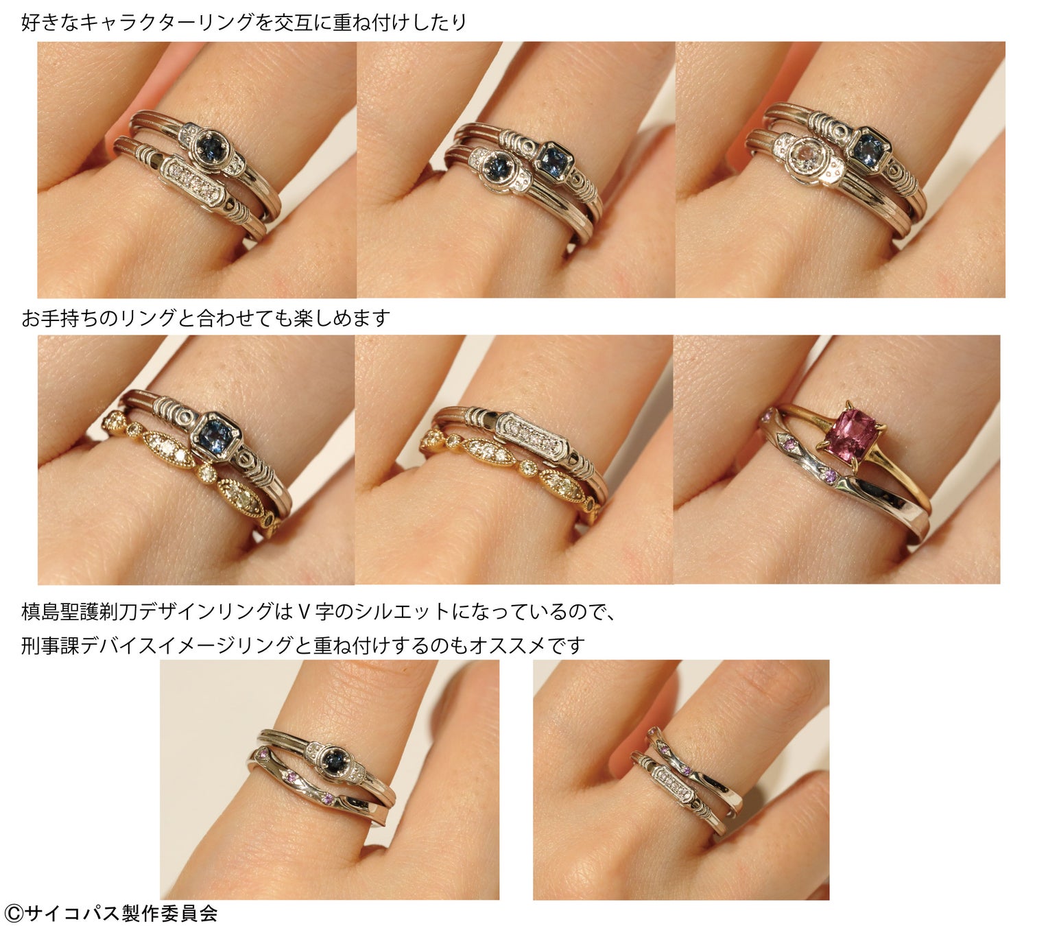 好きなキャラクターリングを交互に重ね付けをして、手元で好きなペアを再現したり、お手持ちのリングと重ね付けして楽しんだり、手元でさりげなく作品への愛を表現するなど、楽しみ方は無限大です。