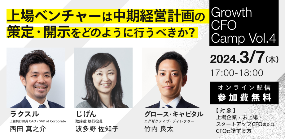 不確実性の高いチャレンジを続ける上場ベンチャーにとって、中期経営計画を公表することは、投資家に目指す姿や目標達成へのコミットメントを訴求できる一方で、経営戦略の柔軟な軌道修正の足枷になりうるジレンマもあります。本イベントでは上場後も高成長を実現するラクスル 西田CAOとじげん 波多野取締役をゲストに迎え、中期経営計画の策定及び開示までの舞台裏や中期経営計画を開示した場合のメリット、デメリットなどに迫ります。
