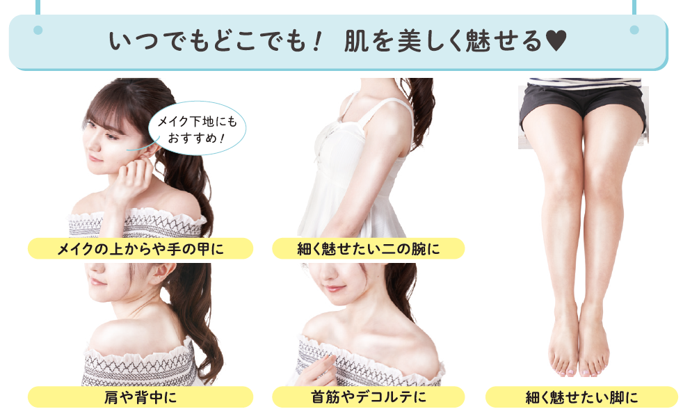 広範囲使いはもちろん、塗りにくい首筋や焼けやすい手の甲、細く魅せたい腕や脚など、部分使いに便利な形状です。