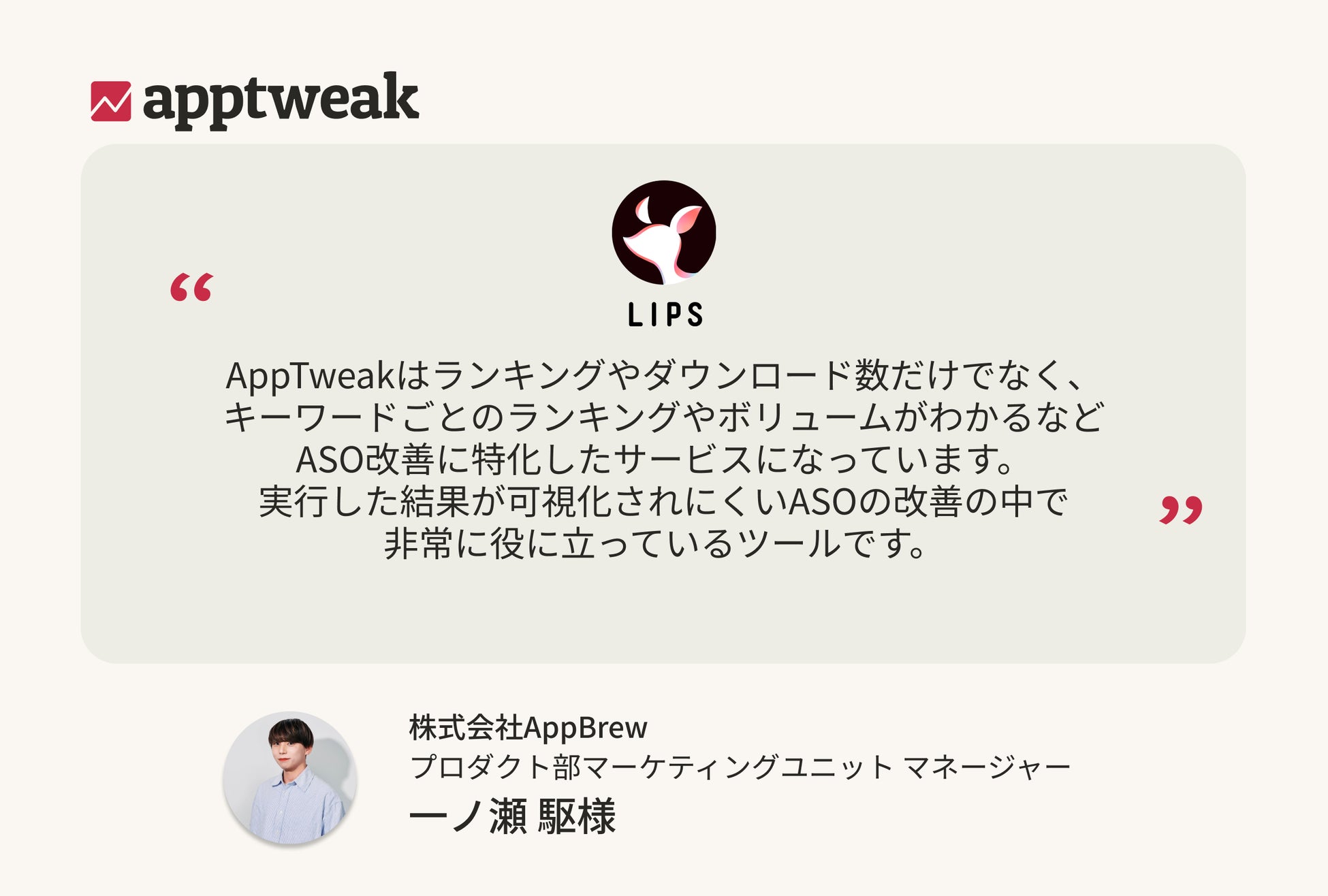 アプリストア特化型マーケティングプラットフォームを提供するAppTweak Japan合同会社 (本社: ブリュッセル、ベルギー、代表: Olivier Verdin、以下「AppTweak」) は、コスメ・美容プラットフォームサービス「LIPS」を運営する株式会社AppBrew (本社: 東京都文教区、代表取締役社長: 深澤 雄太、以下「AppBrew」) にAppTweakのASO Intelligenceを導入いただきました。