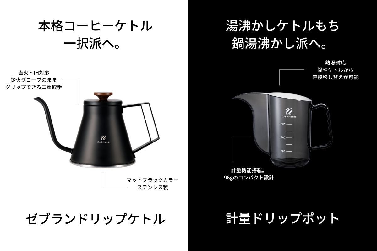 既に湯沸かしとしてケトルやクッカーを所持している方には、熱湯対応トライタン素材の「計量ドリップポット Zebrang」を。やはり一つは本格コーヒーケトルを手に入れたい方には、マットブラックカラーのステンレス素材「ゼブランドリップケトル」を。