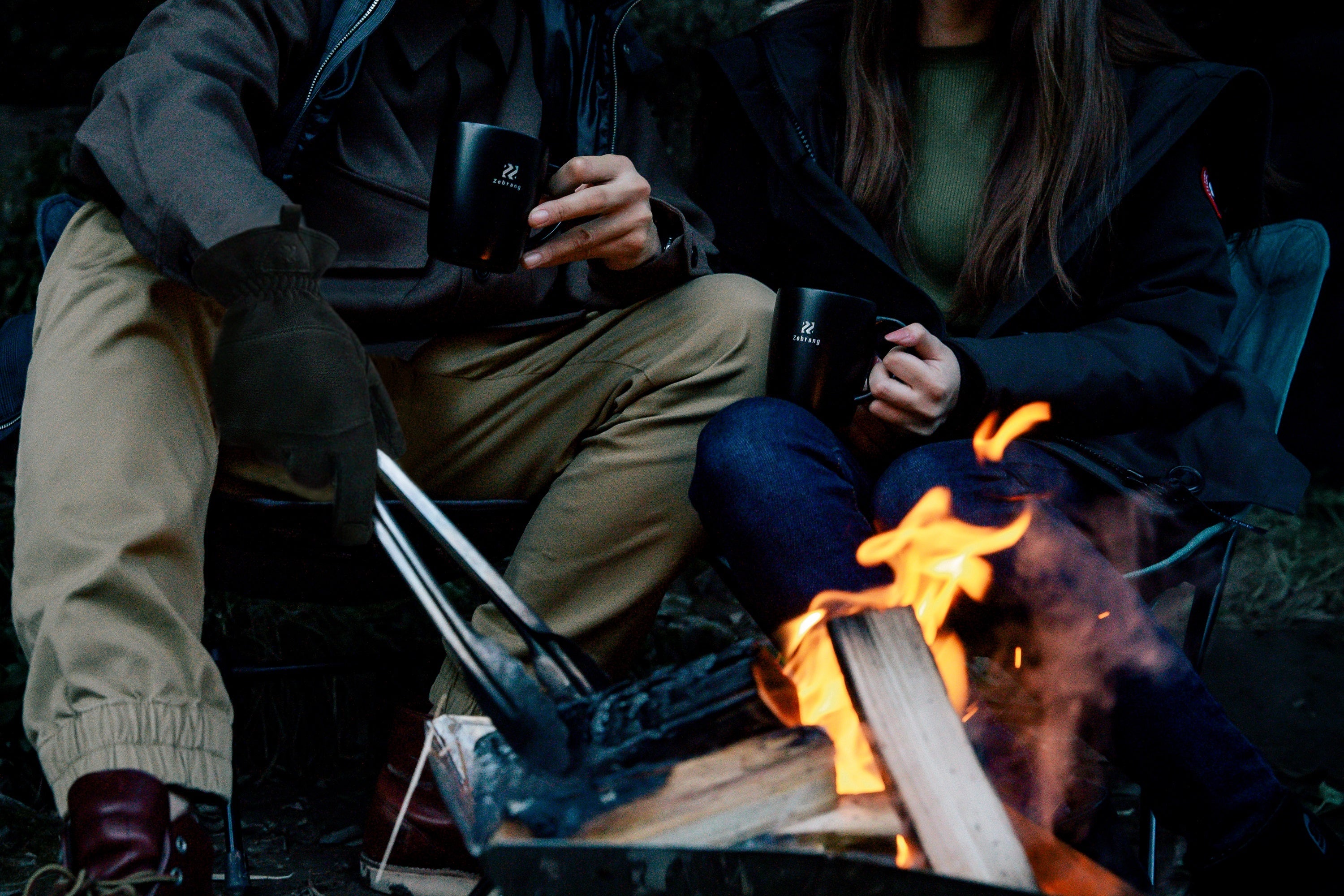想定使用シーンは、焚火~調理~コーヒーシーンまで幅広く想定しています。ドリップケトルは、焚火グローブ装着時でもグリップしやすい二重取っ手構造に。細口ケトルでいつでもドリップが可能です。