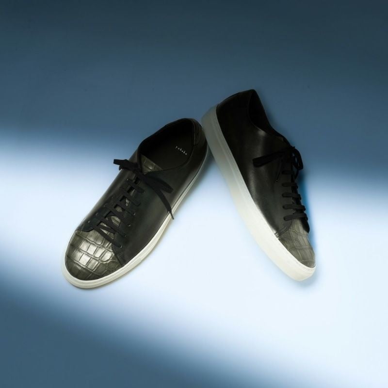 yuhakuの職人が革や鱗の状態を見極めながら染色し、艶やかに磨いたクロコダイルレザーを使用したスニーカーです。 牛革とのコンビ仕様にすることで素材の美しさを引き立てながらも、ほどよい高級感に仕上げました。