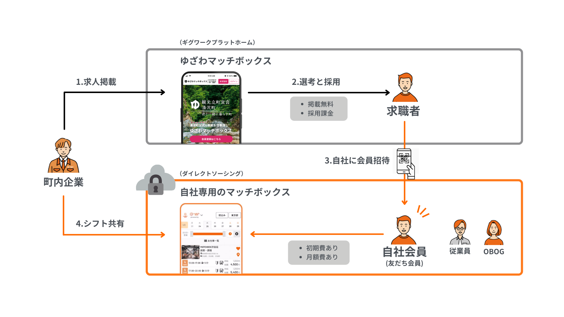 本事業ではマッチボックステクノロジーズがプラットフォームの提供および管理保守・運用を行い、企業はマッチボックステクノロジーズに利用申し込みを行います。利用企業による湯沢町内を就業地とした求人は「ゆざわマッチボックス」およびアプリケーション上に集約され、湯沢町内の求人を全国から閲覧・応募することができるようになります(https://matchbox.jp/niigata/yuzawa/)。