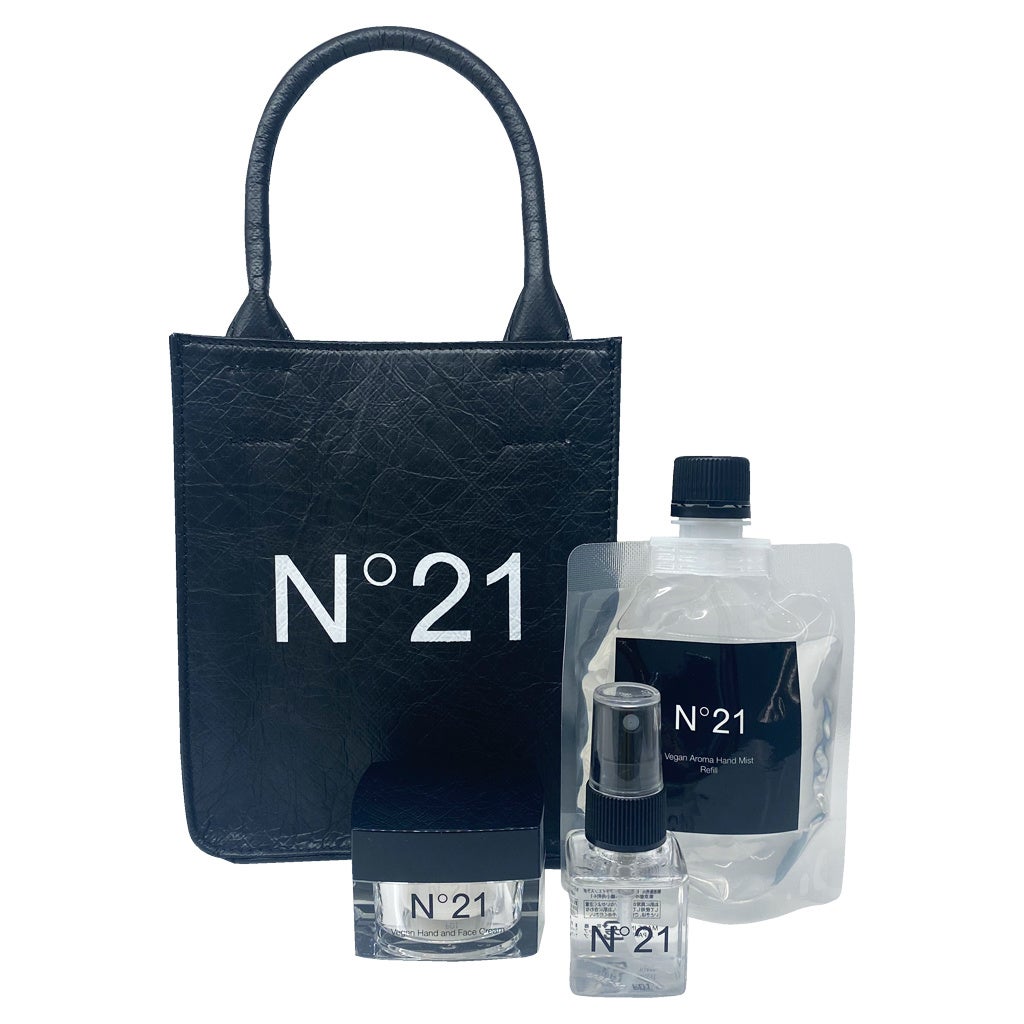 日本製のヴィーガンハンドケアキット。防腐剤・保存料を一切使用せず、100%植物由来成分でお作りしています。ハンドミストは詰め替え用のレフィル付き。N21のロゴ入りのバッグとのセットになっています。