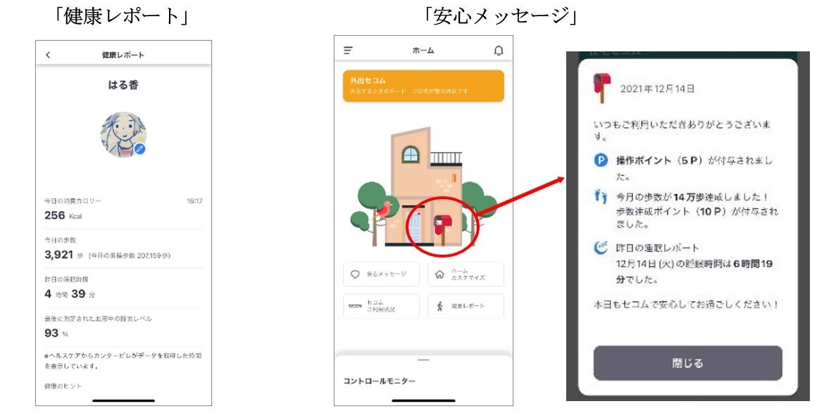 「Apple Watch」で取得した消費カロリー、歩数、睡眠時間、血液中の酸素レベルといったヘルスケアデータを「iPhone」の「SECOM カンタービレ」アプリで「健康レポート」として可視化し、健康管理に役立てることが可能です。活動量やセキュリティの操作情報をまとめた「安心メッセージ」からアプリの日々の活用状況を確認することもできます。