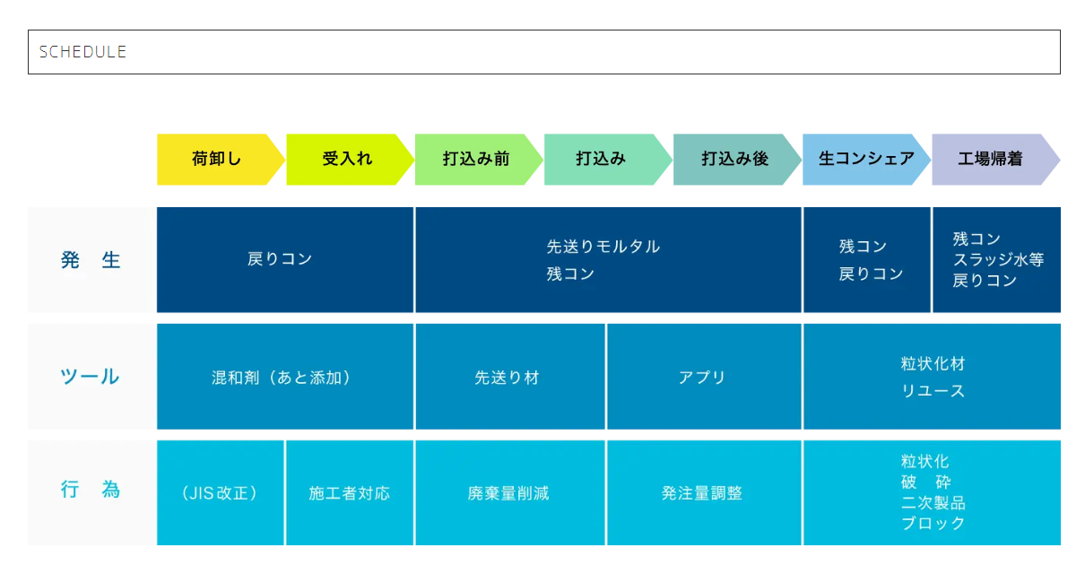 このページでは、分科会にご参画している企業の技術をベースに、生コンの出荷時から工場帰着時までの一連の作業において発生する残コン・戻りコンを減らすための技術を仕分けし、各地点で使用できる技術を整理しております。