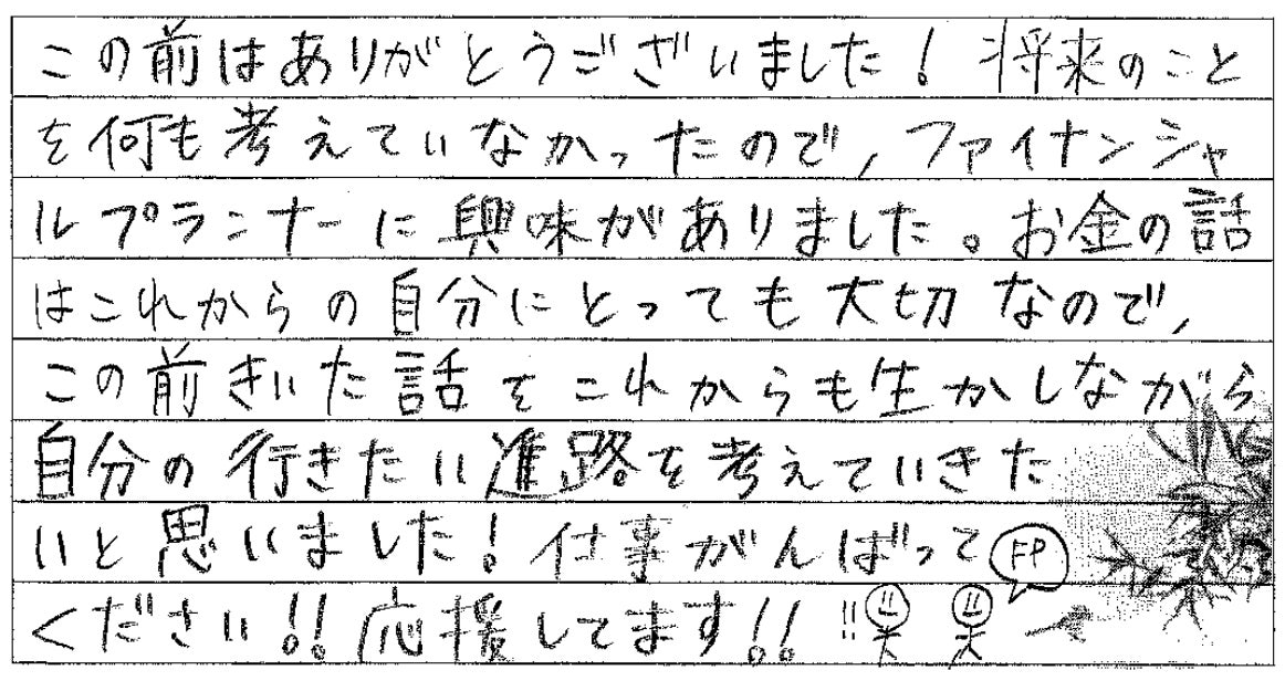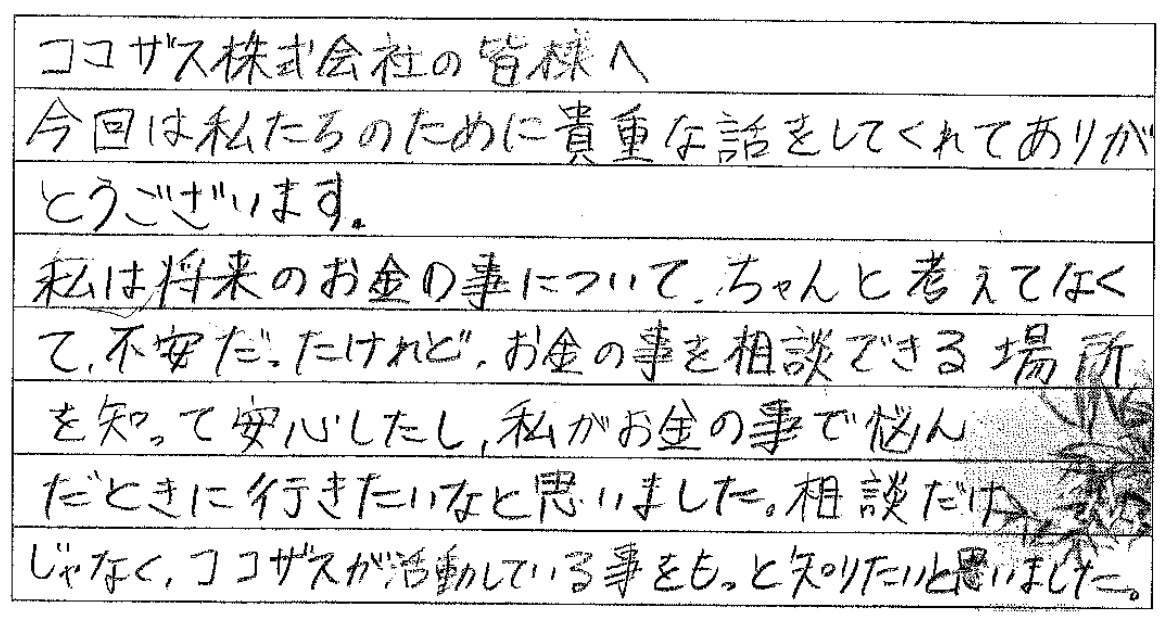 FPの仕事について詳しく説明していただくのみならず、お金にまつわるお話やグラフや写真なども用いて説明してくださったので、とても分かりやすかったです。