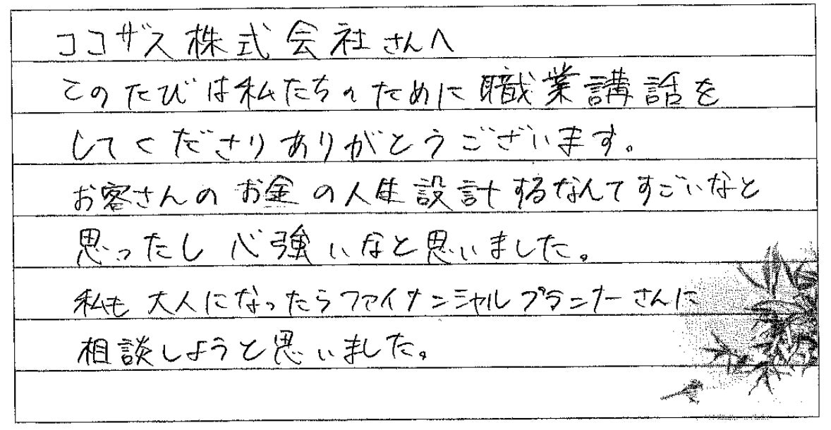 講話後には、多くの生徒から「私もお客様の不安や不満をなくす仕事に就きたい」「大人になったらFPに相談したいと思った」といった感想が寄せられました。
