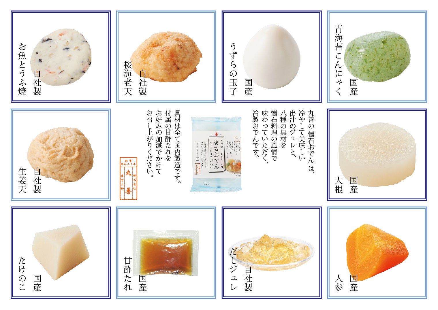 具材は、「大根」「人参」「たけのこ」「青海苔こんにゃく」「うずらの玉子」「桜海老天」「お魚とうふ焼」「生姜天」の8種で、それぞれ1個ずつ入っています。具材は食べやすい小ぶりサイズで、一つ一つの味わいや食感を味わって頂けます。うずらの玉子や野菜類は国産、練り物はすべて国内の自社工場で製造しております。