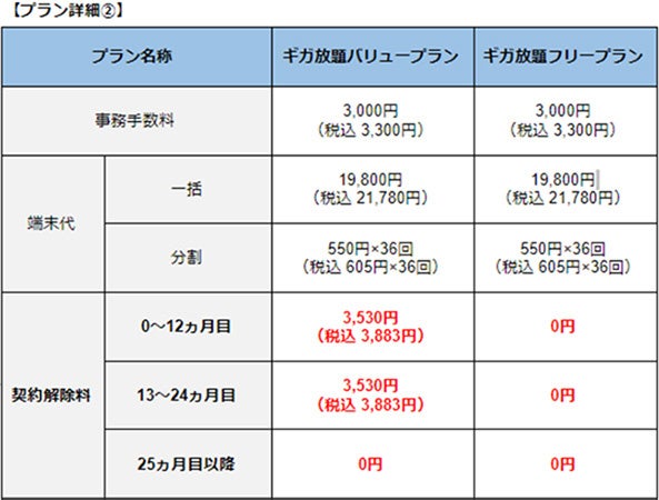 ギガ放題バリュープランは、2年の契約期間があります。そのため、2年以内に契約を解除する場合は契約解除料金が発生いたします。その際の料金は、基本的に月額利用料と同額となっています。