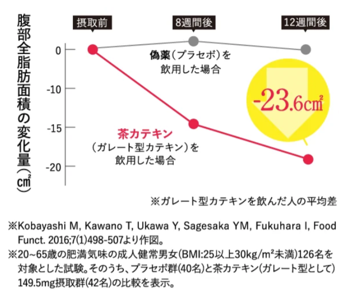 茶カテキン(ガレート型カテキン)を飲用して12週間で腹部全脂肪面積が-23.6㎠になった