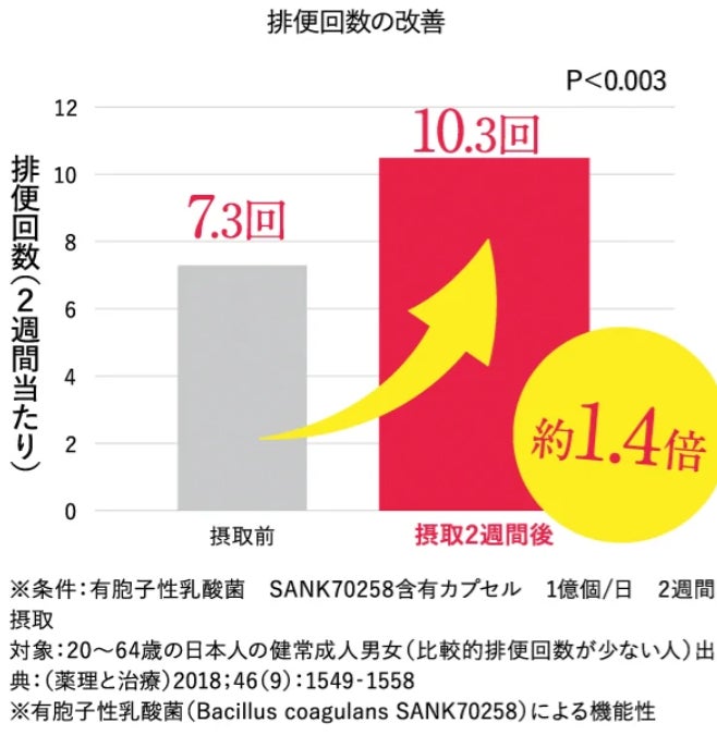 有胞子乳酸菌含有カプセルを2週間摂取し続けた結果、排便回数が約1.4倍になった