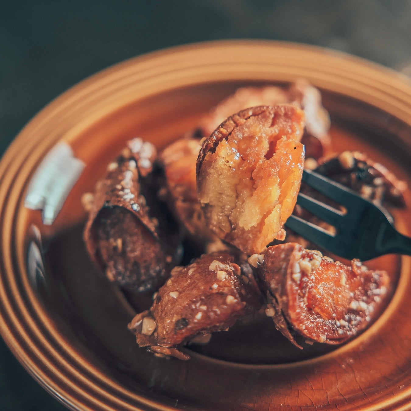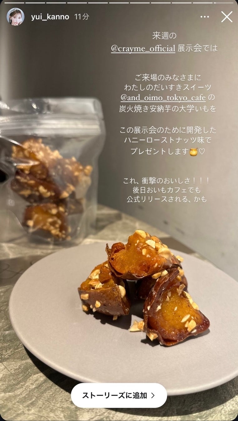 オイモトーキョーのファンとしても知られるモデル・菅野結以さんのアパレルブランド「crayme.」の展示会ノベルティとして、特別に作られた新フレーバー「ハニーローストナッツ」。3ヶ月熟成させた安納芋に、香ばしいローストナッツと贅沢に蜂蜜を絡めた上品な味わいが、多くの来場者から絶賛されました。菅野結以さん自身も「これが商品化されないのは惜しい!」とラブコールをいただき、今回の正式販売となりました。