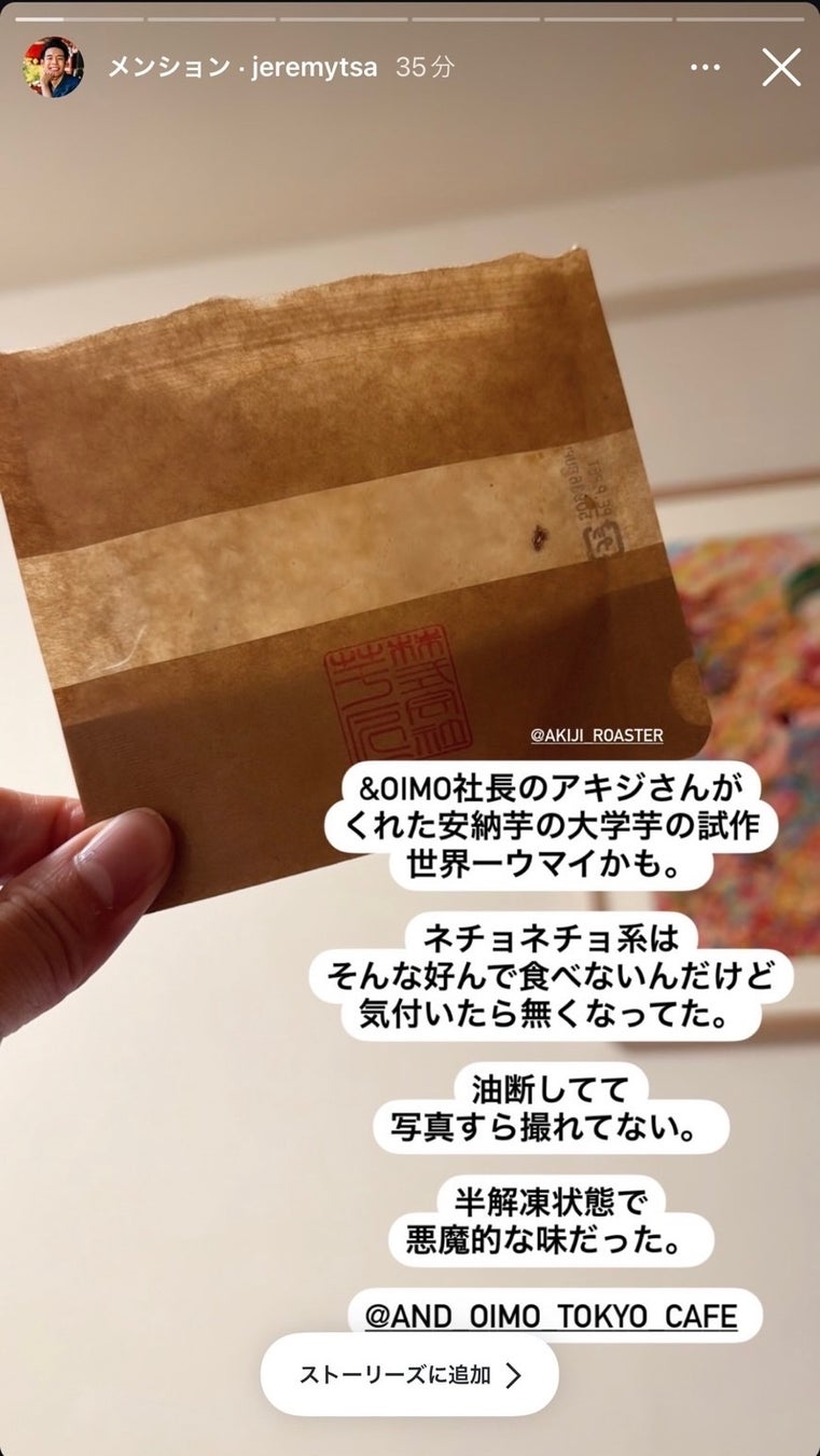 「本当にいいものしか紹介しない」と評判のライフハック系インフルエンサーのジェレミーさんのストーリー投稿を見て、発売と同時に売り切れ続出となったのがこの蜜芋大学シリーズ。彼自身、全フレーバーを制覇しており、新味の「ひらめき和七味」も自身のSNSで紹介。「七味のスパイス感と蜜芋の甘みが絶妙」「悪魔的な味わい」と絶賛し、10万人を超える熱狂的なフォロワーからも多くの共感を得ています。彼のストーリーをきっかけに、SNS上で「#蜜芋大学」「#世界一美味しい大学いも」が話題に。