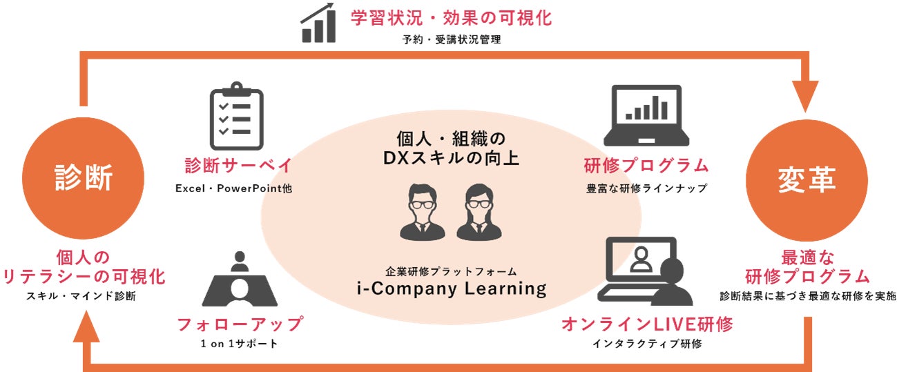 「i-Company Learning」は、“組織における個人が主体的に学び続けるi-Companyを実現する”という想いから名付けました。スキルアップやキャリア開発を通じて生産性と成果を高め、個人と組織の継続的成長を実現します。