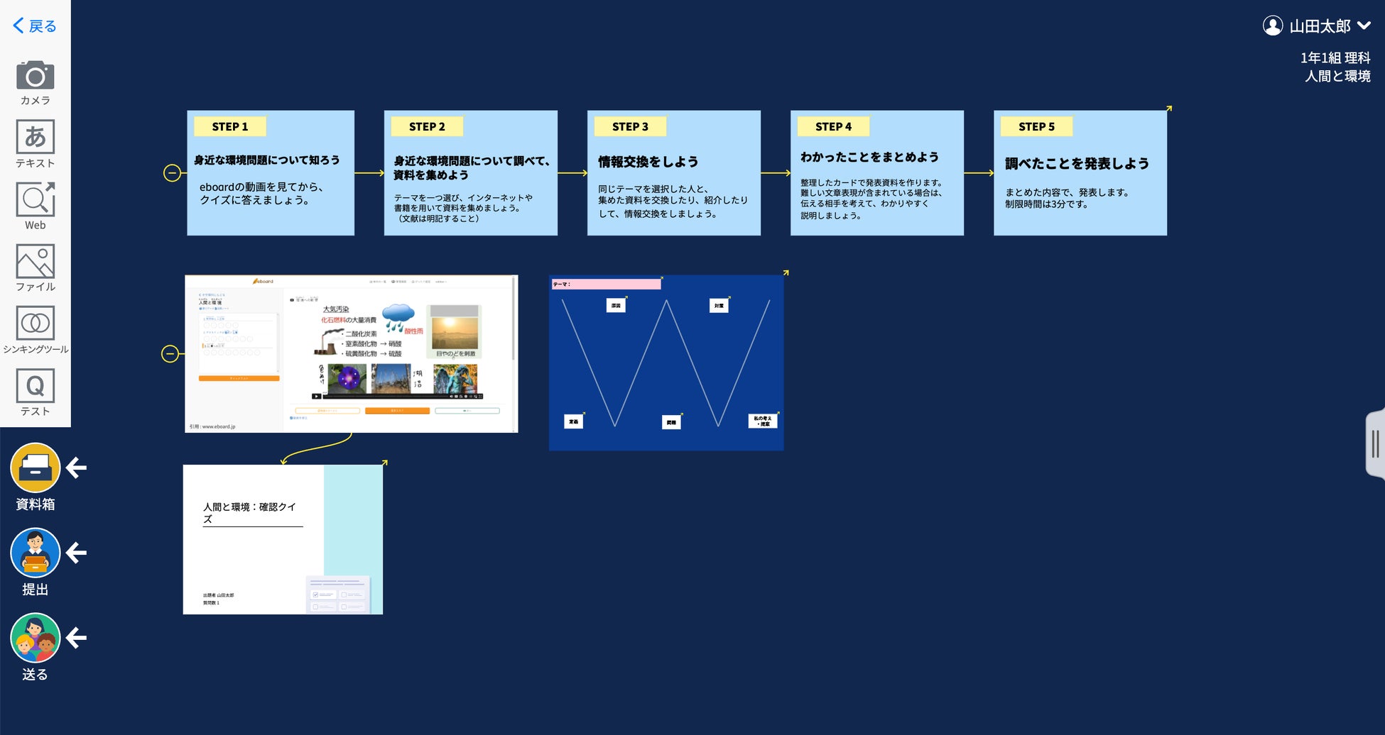 「ロイロノート・スクール」とICT教材eboardの相乗効果で、子どもたちの主体的な学びが可能になります。例えば、「ロイロノート・スクール」のWebカード機能を使うと、一般のWebページやeboardの教材(リンク)を画像付きカードとして保存できます。これにより、基礎知識をeboardで学び、さらに詳細情報を収集・整理し、自ら調査し考える力が育まれます。探究心や問題解決能力、コミュニケーション能力の向上が期待されます。
