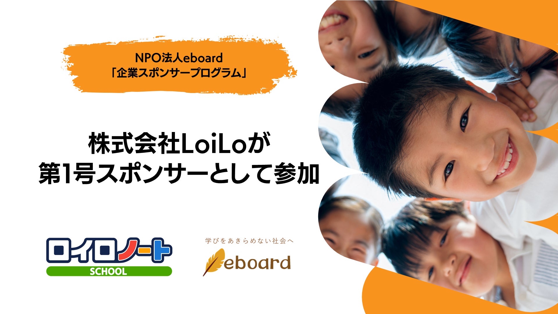 NPO法人eboardは、企業に年間一定金額のご協賛をいただく「企業スポンサープログラム」をスタートしました。第1号スポンサーとして、全国13,000校以上で毎日約250万人の児童・生徒が利用する「ロイロノート・スクール」を開発・提供する株式会社LoiLoが参加します。株式会社LoiLoは、「学びをあきらめない社会の実現」をミッションとするNPO法人eboardの活動に共感し、スポンサープログラムを通じてその活動を応援します。