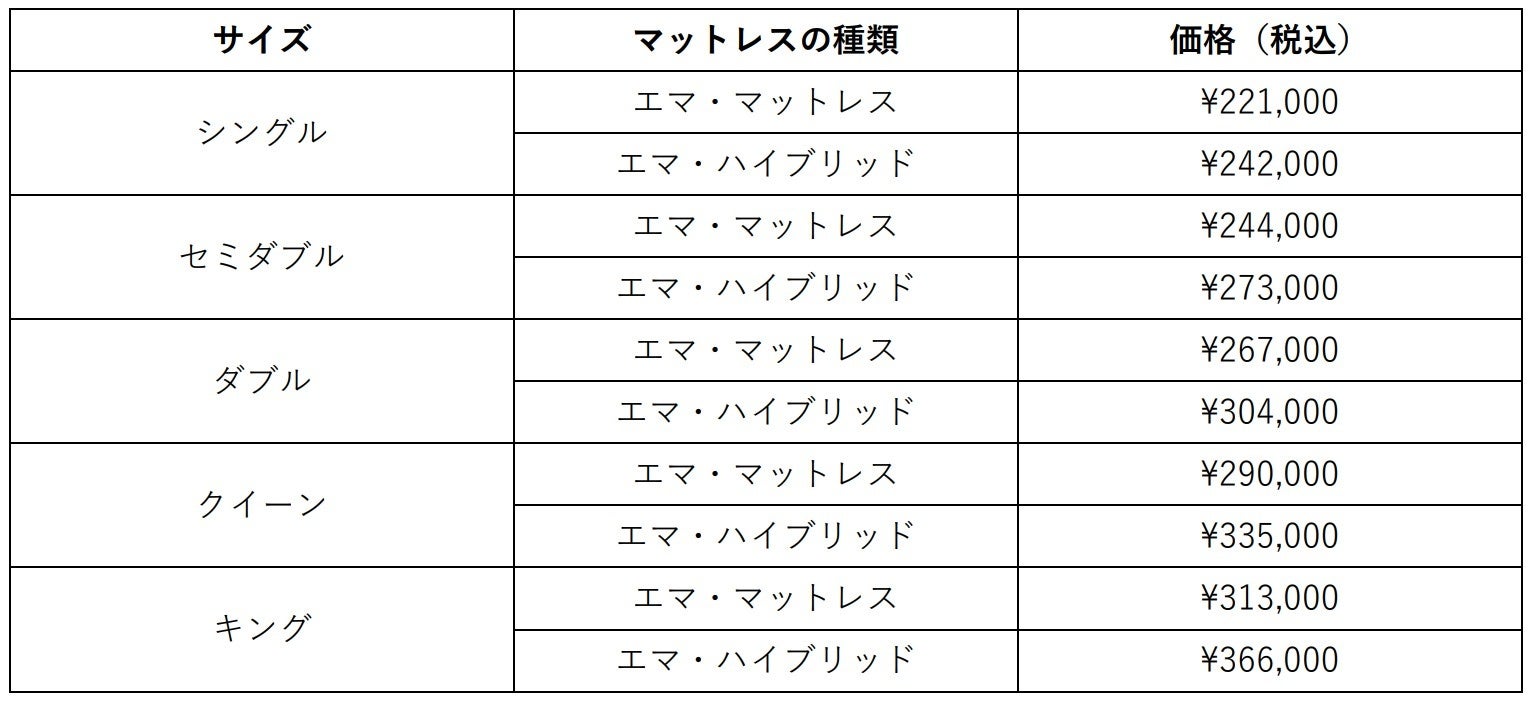 1、マットレス(エマ・マットレス、エマ・ハイブリッドの2種類からお選びいただけます)