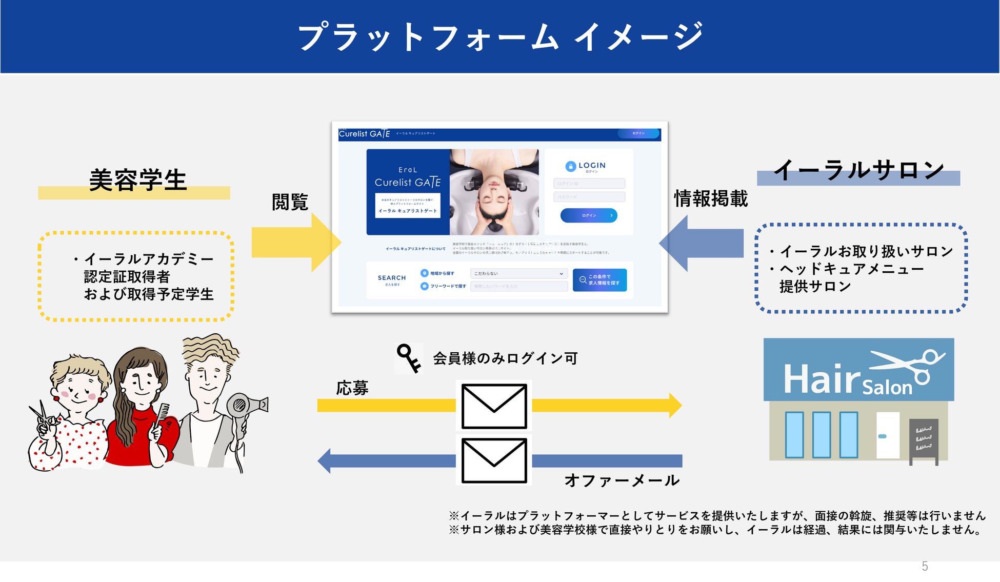 イーラルでは、美容師の卵に就職後すぐ活躍できる環境を用意すべく、美容師を目指す学生と美容室を繋ぐ求人プラットフォームサイト「イーラルキュアリストゲート」を開設いたしました。