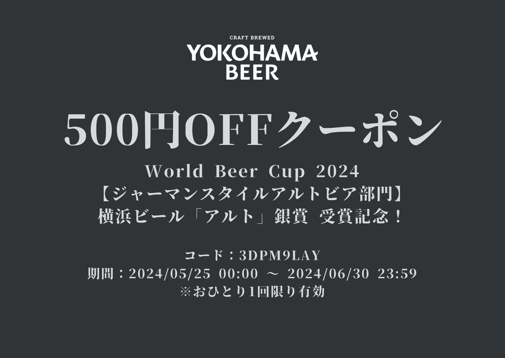 「World Beer Cup 2024」のジャーマンスタイルアルトビア部門銀賞受賞を記念して、自社オンラインストア限定のお得なクーポンコードを2024年5月25日(土)〜6月30日(日)の期間限定でプレゼント!対象商品を500円引きでご購入頂けます。この機会に是非、お楽しみ下さい!