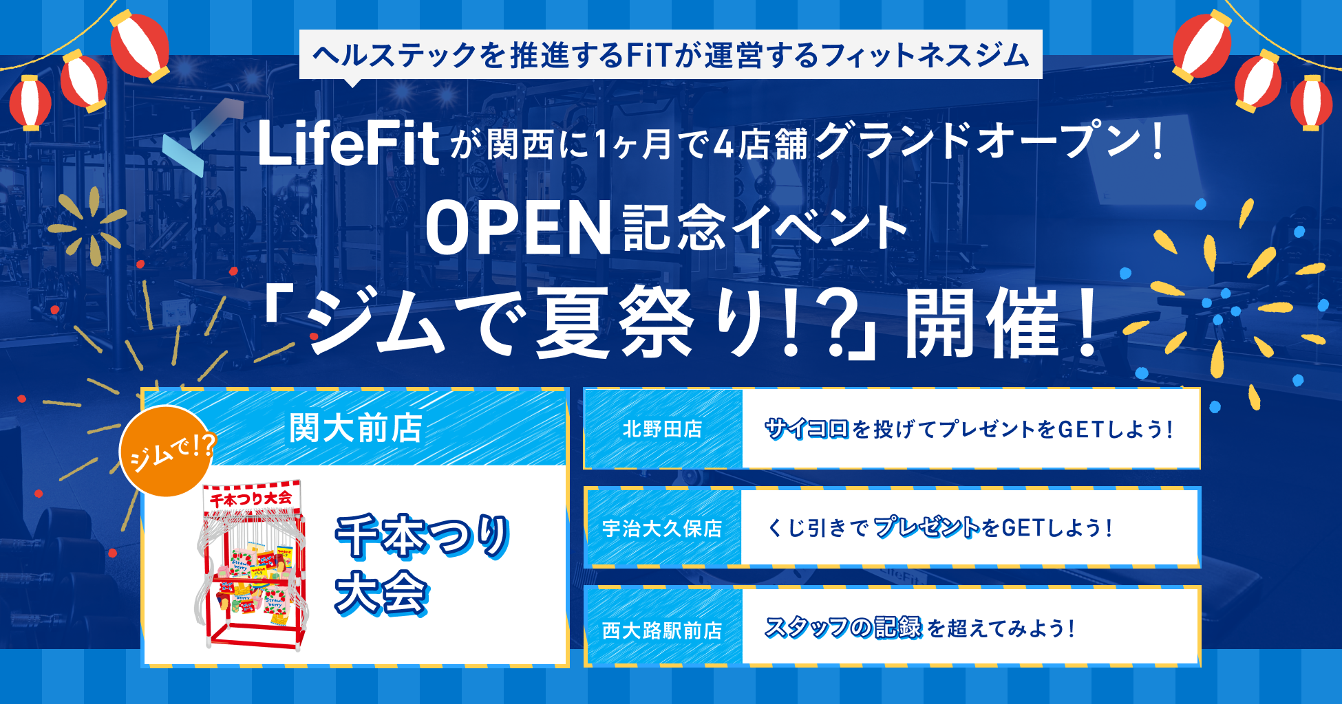 ヘルステックを推進するFiTが運営するフィットネスジム【LifeFit】が関西に1ヶ月で4店舗グランドオープン!店舗ごとにOPEN記念イベント「ジムで夏祭り!?」開催!