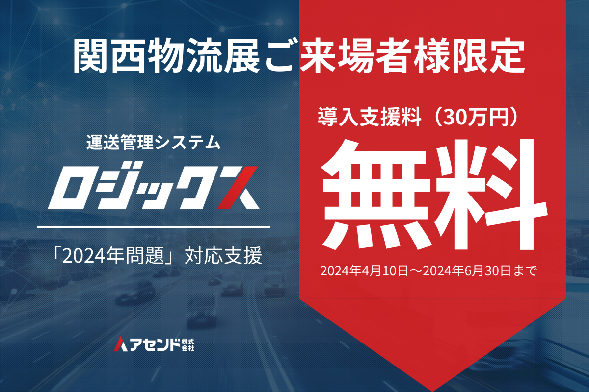 この度、先述の物流危機を加速させる一因ともいわれる「物流の2024年問題」に突入したことを受け、DX支援を加速していくべく、関西物流展に来場いただいた方限定で「導入支援料」を弊社にて負担させていただくキャンペーンを実施いたします。ぜひこの機会に「ロジックス」を通じたDX・経営強化をご検討いただけますと幸いです。