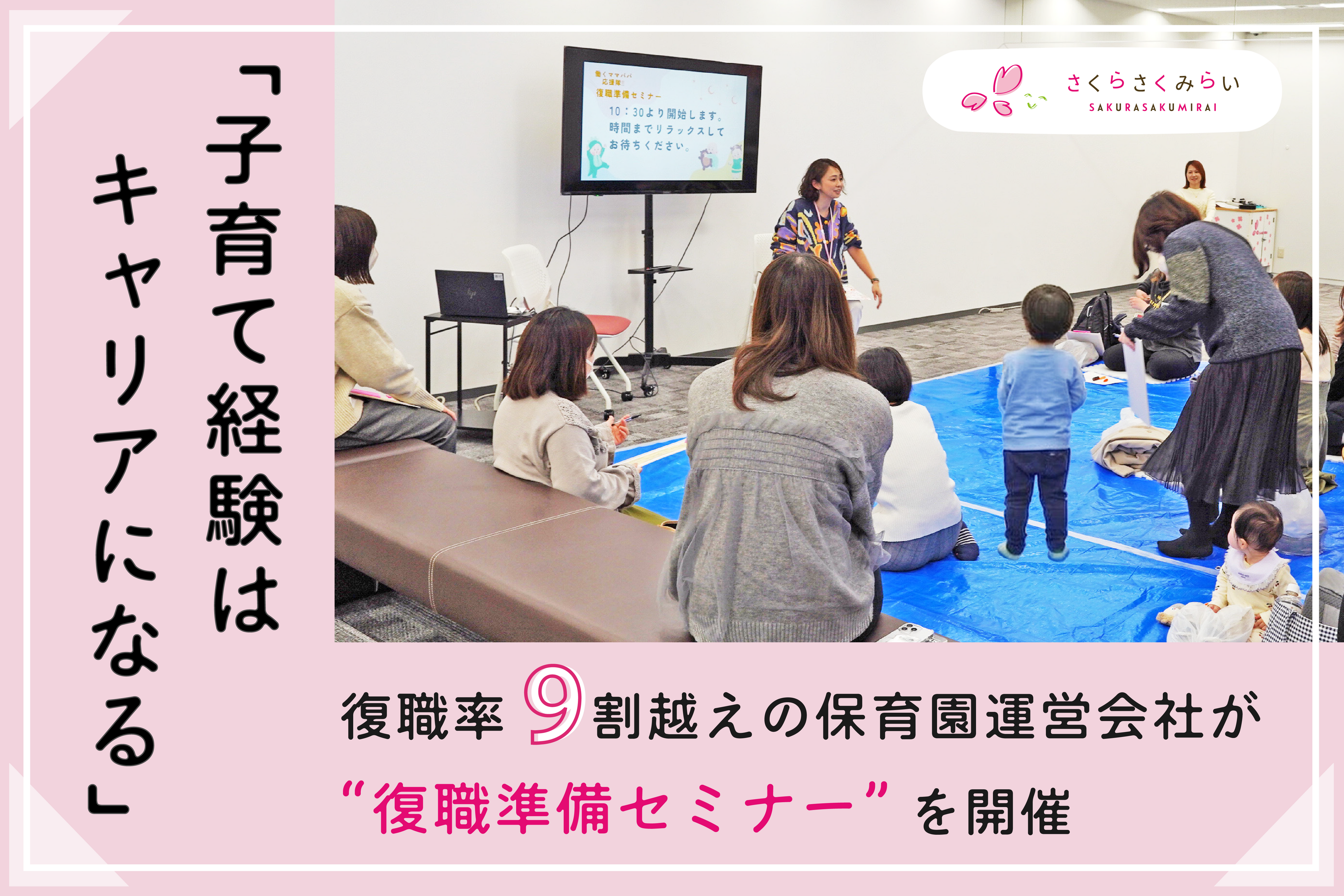 「子ども・保護者・職員」三者の笑顔に満ちた子育て環境の創出を⽬的に、東京を中心に保育園運営 を⾏う株式会社さくらさくみらい(本社:東京都千代田区、代表取締役社長:森田周平、以下「当社」) は、今春復職を予定する育休取得者を対象に「復職準備セミナー」を開催しました。本セミナーは、子育て中の社員のみで構成された「働くママパパ応援隊‼」が企画・運営したもので、制度説明だけでなく、実際に子育てをしながら働くリアルを共有し、復職後の働き方や今からできる準備を伝え、心理的負担の軽減や前向きな職場復帰を後押しする目的で開催されました。