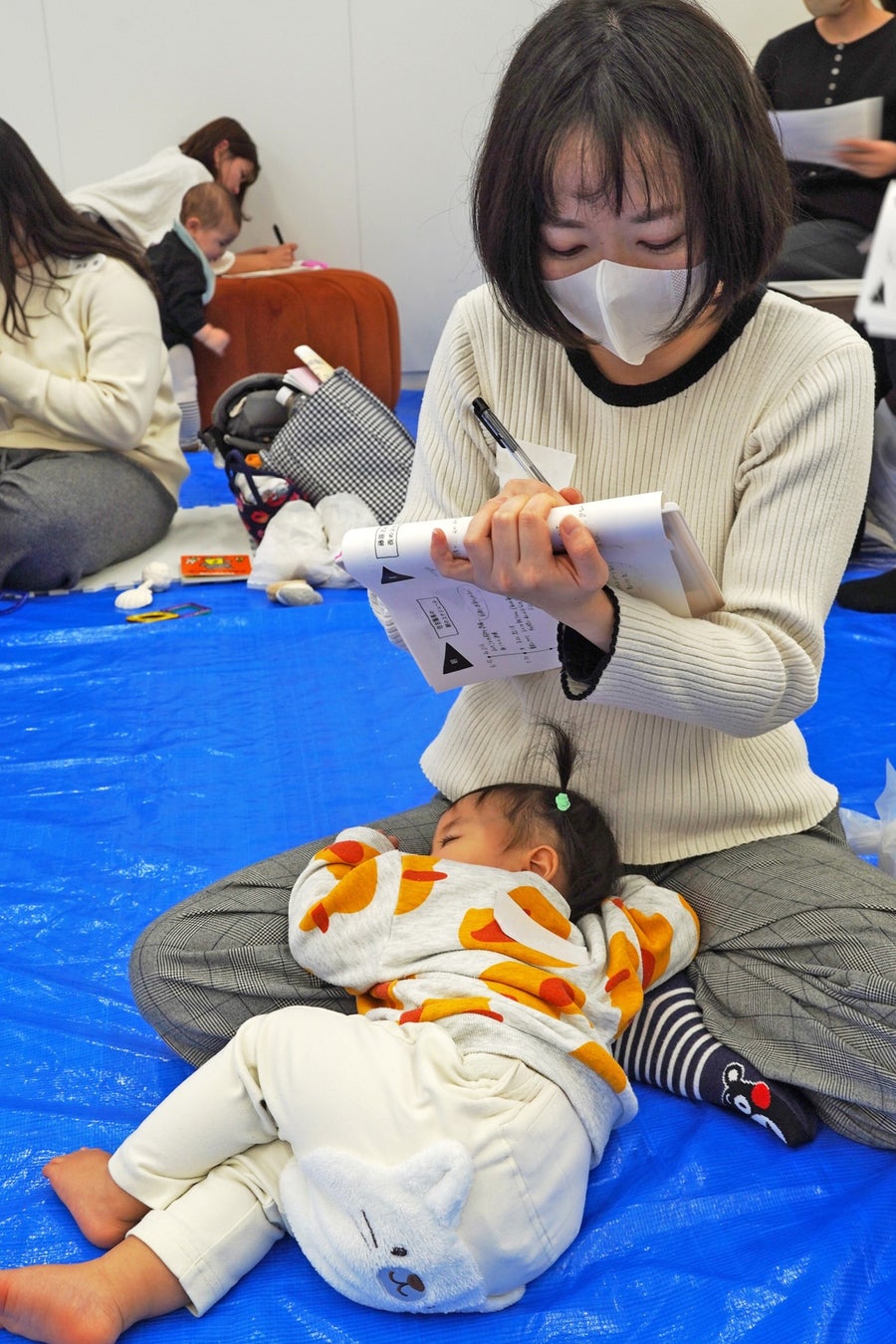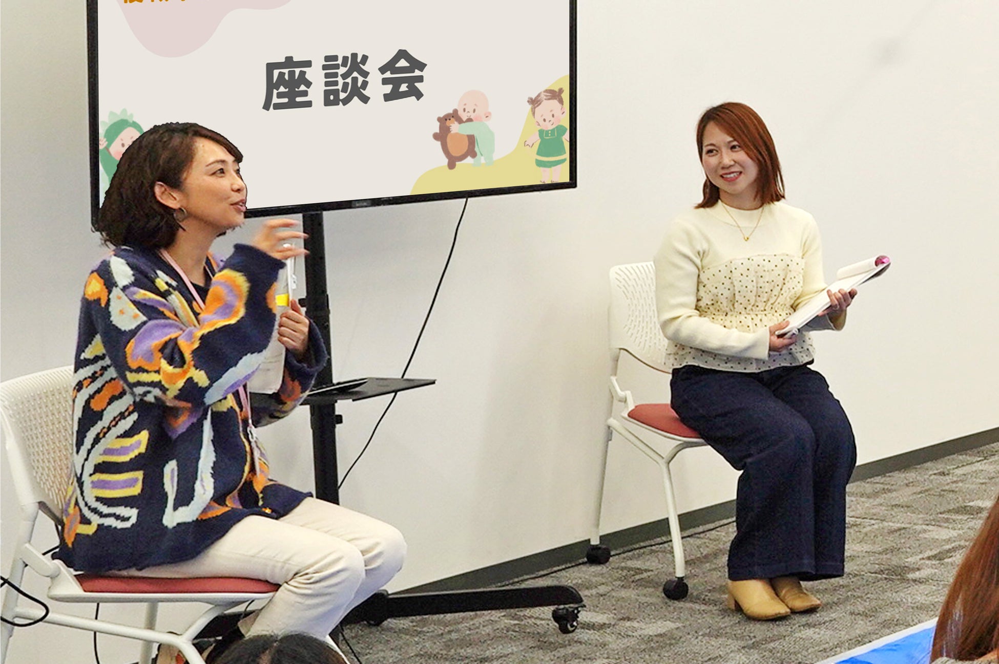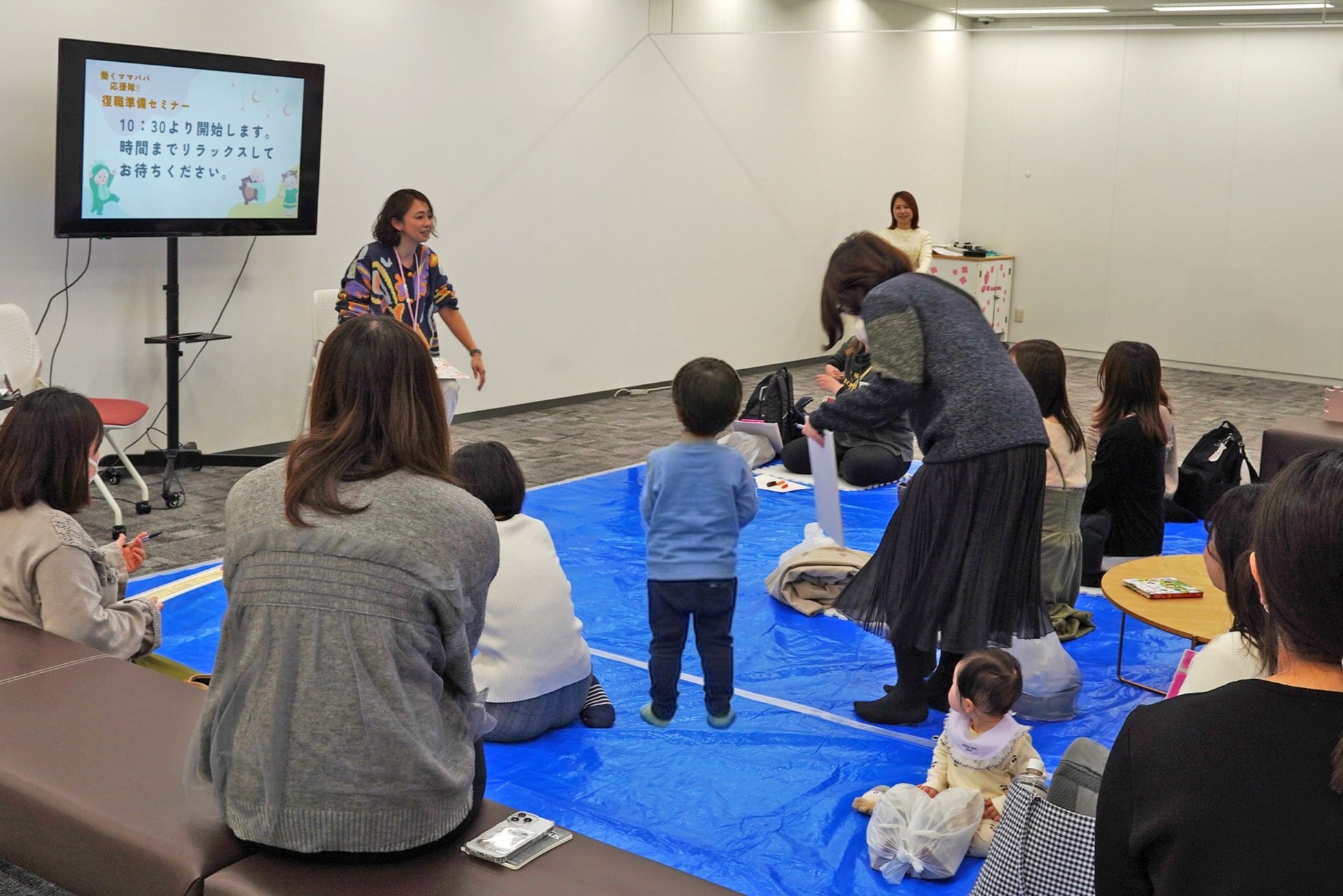 本セミナーは直接顔を見て話すことに重きを置き、対面で実施いたしました。子どもたちがおやつを食べたり、赤ちゃんがハイハイをしたりすることも想定し、会場にはブルーシートを敷きローテーブルも完備。衛生面を保ちつつのびのびと過ごせる環境を設定いたしました。