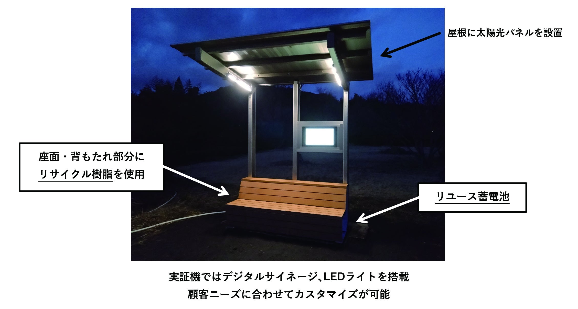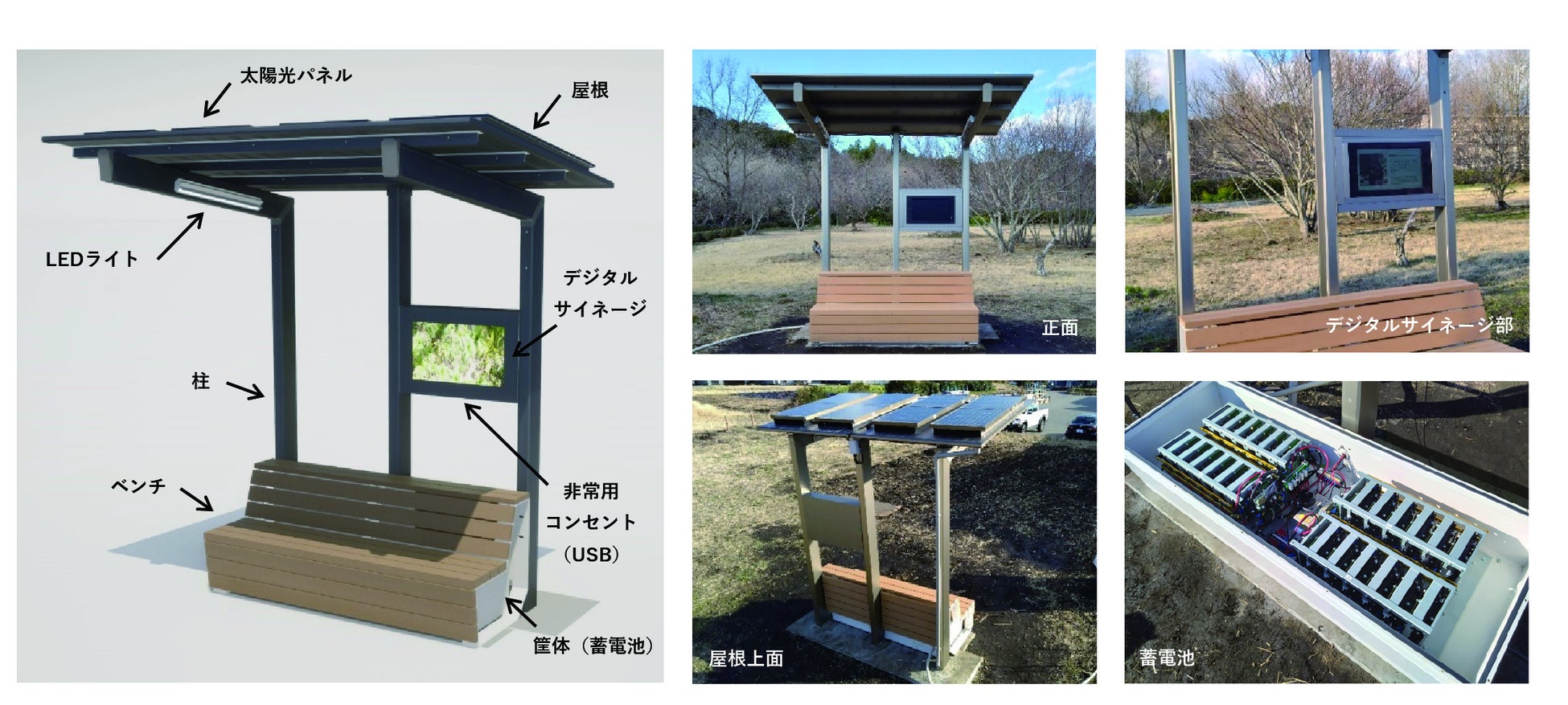 本実証機は、ベンチの座⾯・背もたれ部分に使⽤済みのプラスチック廃材をリサイクルした再⽣⽊材(※1)を使⽤しており、また使⽤済みの⾃動⾞から取り外したリチウムイオン電池をリユースした(※2)環境配慮型のスマートベンチです。公共の設備及び電源としての機能に加え、リサイクル・リユースをコンセプトとしたことでカーボンニュートラルへの貢献も期待されます。
