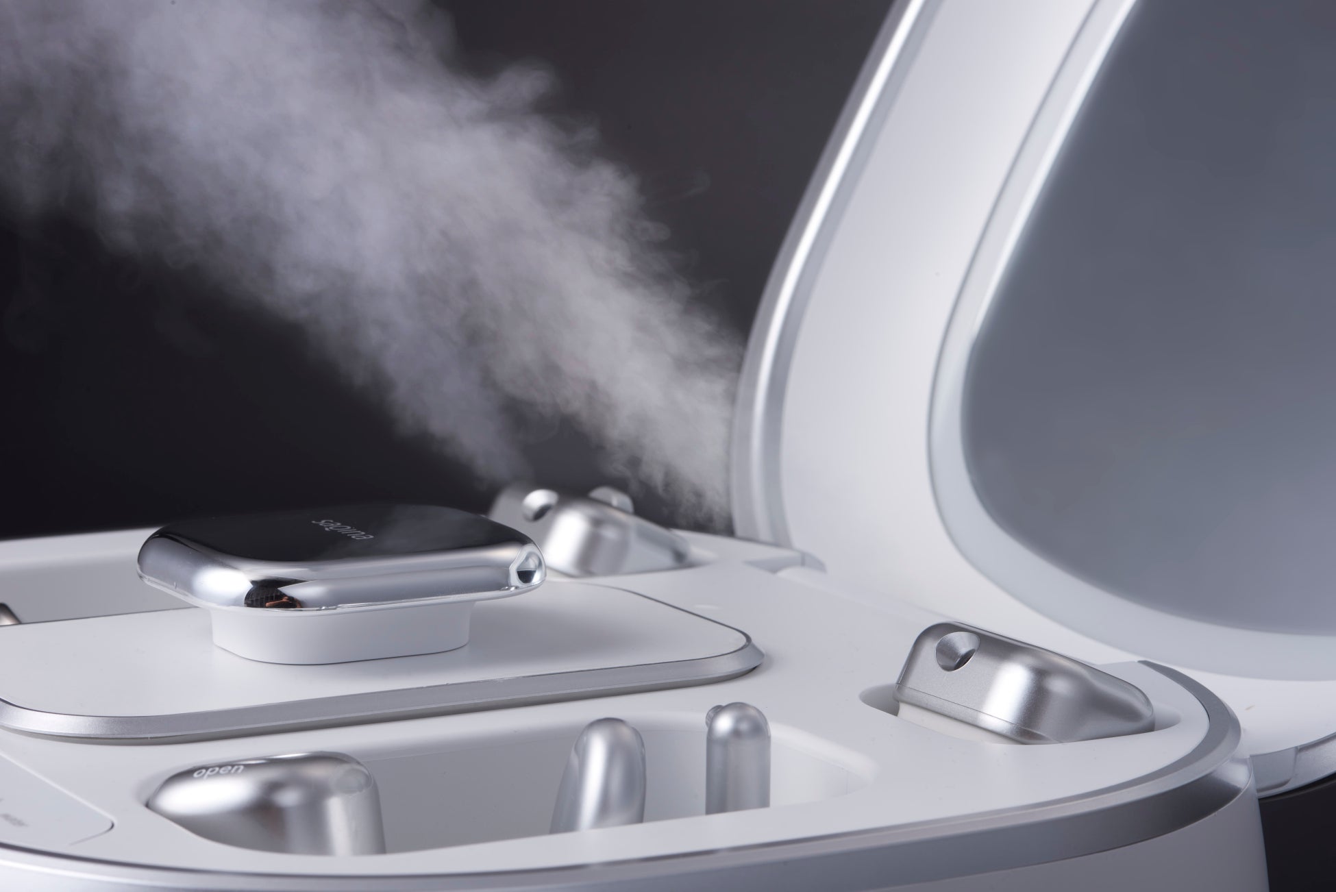 スイッチを押して約1分でファイン化したファインスチームがダブルで噴出。水分をたっぷりと与えながらお顔全体をムラなく包み込み保湿、みずみずしいうるおい肌へと導きます。