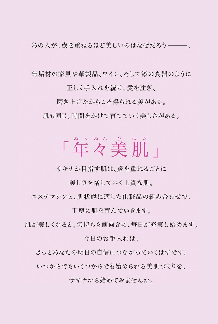 2022年には創業40年を迎え、2024年「あなたが美しいと、わたしもうれしい。」を企業メッセージとして掲げ、これからもサキナは一人ひとりに寄り添い、その人が持つ肌本来の力をサポートする本質の美容法を提供し続けます。