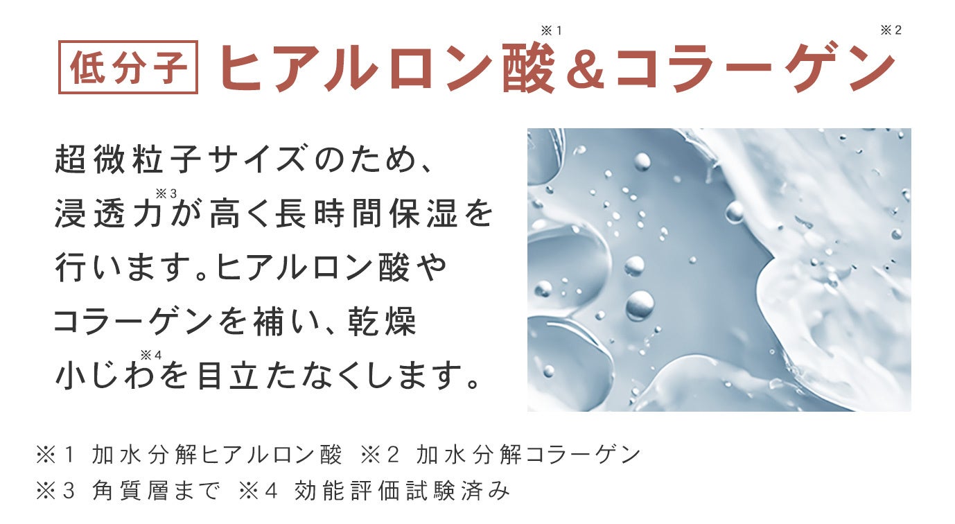 ▼平均分子量1/10,000の超微粒子[低分子 ヒアルロン酸*8&コラーゲン*9]