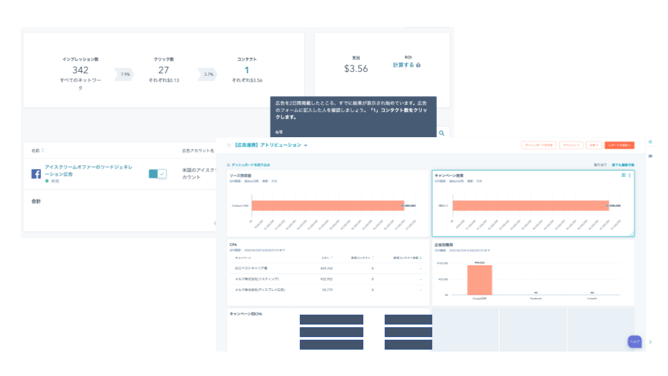 本サービスは、広告施策の効果をHubSpotで可視化し広告の最適解をご提案させていただくものとなります。これによりGoogleアナリティクスだけでは計測できない広告経由のコンバージョンチェックやROIといったデータを可視化しターゲティングなどの見直しを行うことが可能となります。