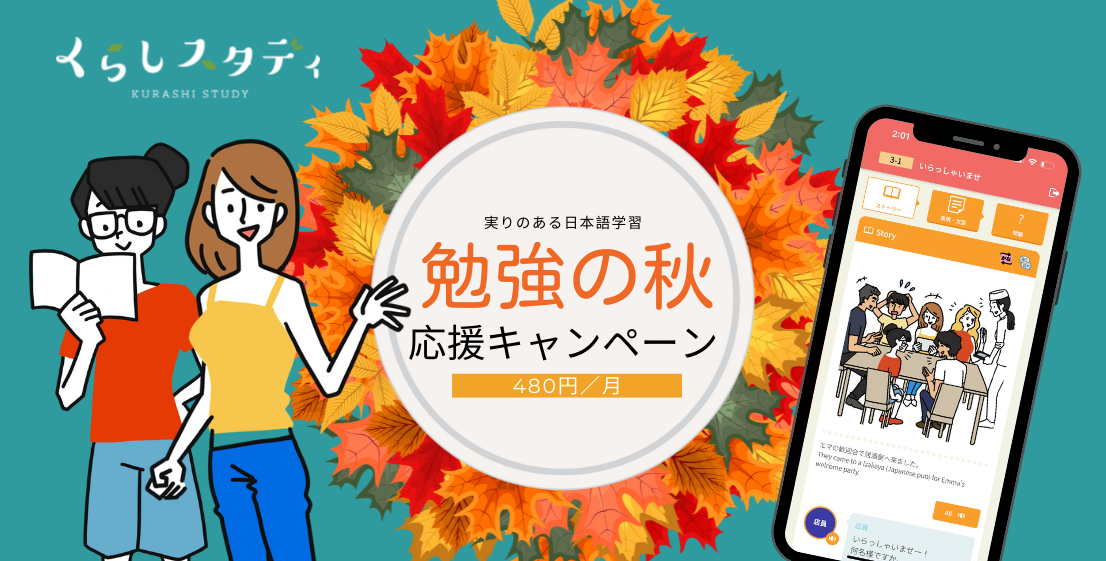 真夏が終わり、過ごしやすい季節になりました。日本では、「スポーツの秋」「読書の秋」「食欲の秋」「芸術の秋」といった、秋の代名詞がたくさんあります。新学期も始まり、新しいことを始めるのにおすすめの季節!そこで、日本語学習アプリ「くらしスタディ」では、『勉強の秋』を応援するお得なキャンペーンを開始いたしました。