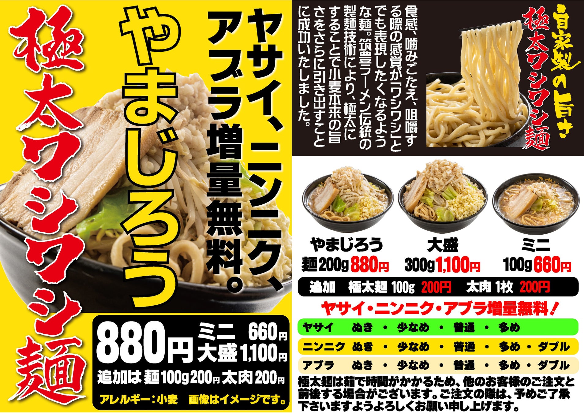 九州筑豊ラーメン史上初の極太ワシワシ麺「やまじろう」を是非ご堪能ください。