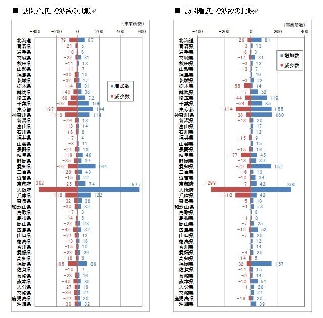 訪問介護は都道府県により増減数の多寡のばらつきが見られ、概ね増加数と減少数が対になっているが、地方部では減少数、都市部では増加数が上回る傾向が見られる。大阪府は突出した増加数で減少数を大きく上回っている。要因の一つとして、近年訪問介護を併設した低廉な住宅型が急増、強い関連性がうかがわれる。また、東京都は減少数が増加数を上回っているが、これは㈱アースサポートや㈱ニチイ学館、SOMPOケア㈱等の大手運営事業者で減少が見られたことも影響している。
