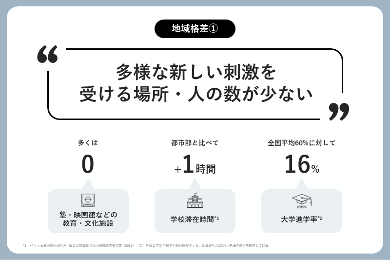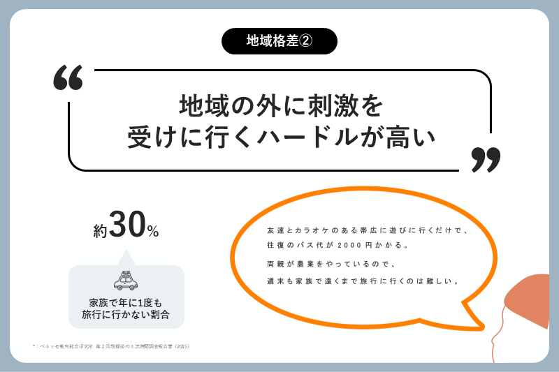 私たちがよく訪れる人口3万人未満の地域では、都市部と比較して多様な職業や生き方をする大人に出会う機会や刺激を受けられる場所に限りがあります。また、自分の世界を拡げるため、環境を変えるために移動する際には、移動距離や交通網の問題で、多くの費用がかかってしまいます。
