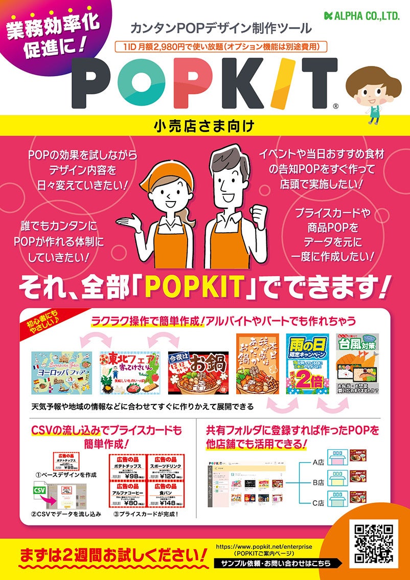 POPKITは、POP作成に費やしていた時間を大幅に削減するWEBサービスです。クリエイターが制作したPOP素材をスタンプ感覚で配置するだけで、誰でもカンタン・スピーディーに、POPの作成ができます。本部社員の方も店舗スタッフの方も楽々POP作成と作成POPの共有が可能。売上アップと業務効率化の両方を実現します。