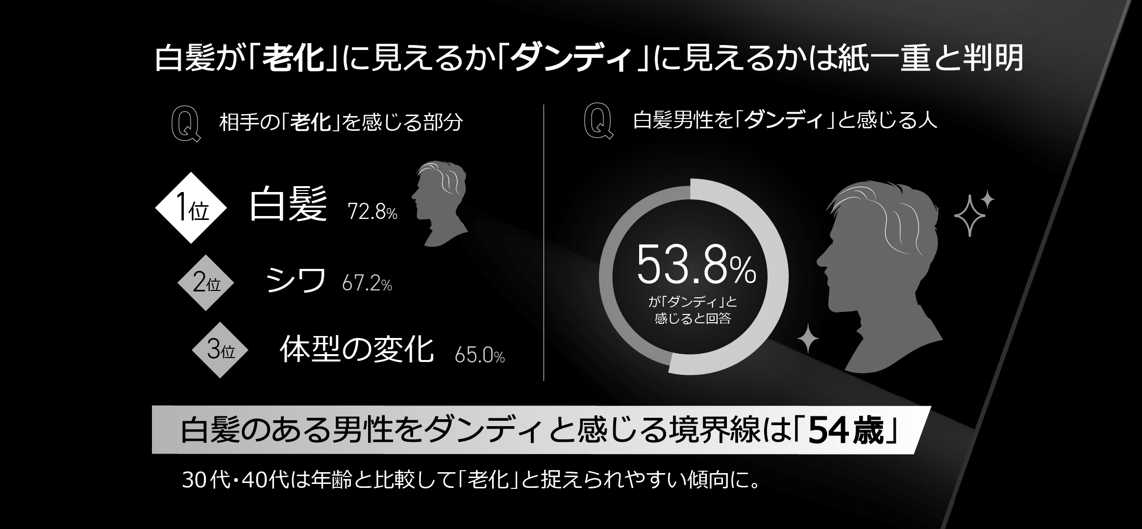 - グレイヘア俳優などの影響を受け、白髪男性を「ダンディ」と感じる人は53.8%。 一方、相手の老化を感じる部分トップも「白髪(72.8%)」という結果に。白髪が「老化」に見えるか「ダンディ」に見えるかは紙一重であると判明。