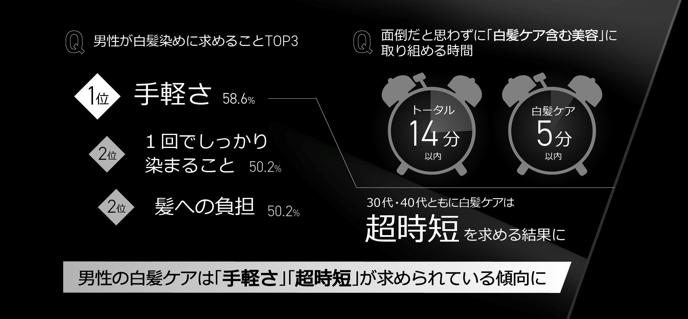 白髪染め初心者でも使いやすいトリートメントタイプ。長年の研究結果をもとに生まれた独自の“濃厚カラー処方”で、放置時間“3分”という短時間で手軽に自然に白髪を染め上げるだけでなく、地肌のケア成分も配合するなど、徹底的に男性に寄り添ったラインアップです。