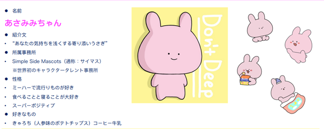 TikTokで注目を集めているうさぎのキャラクター『あさみみちゃん』は、世界初のキャラクタータレント事務所『Simple Side Mascots(サイマス)』所属のキャラクターです。深く考えてしまいがちな世の中で“あなたの気持ちを浅くする寄り添いうさぎ”で只今人気急上昇中の注目キャラクターです。