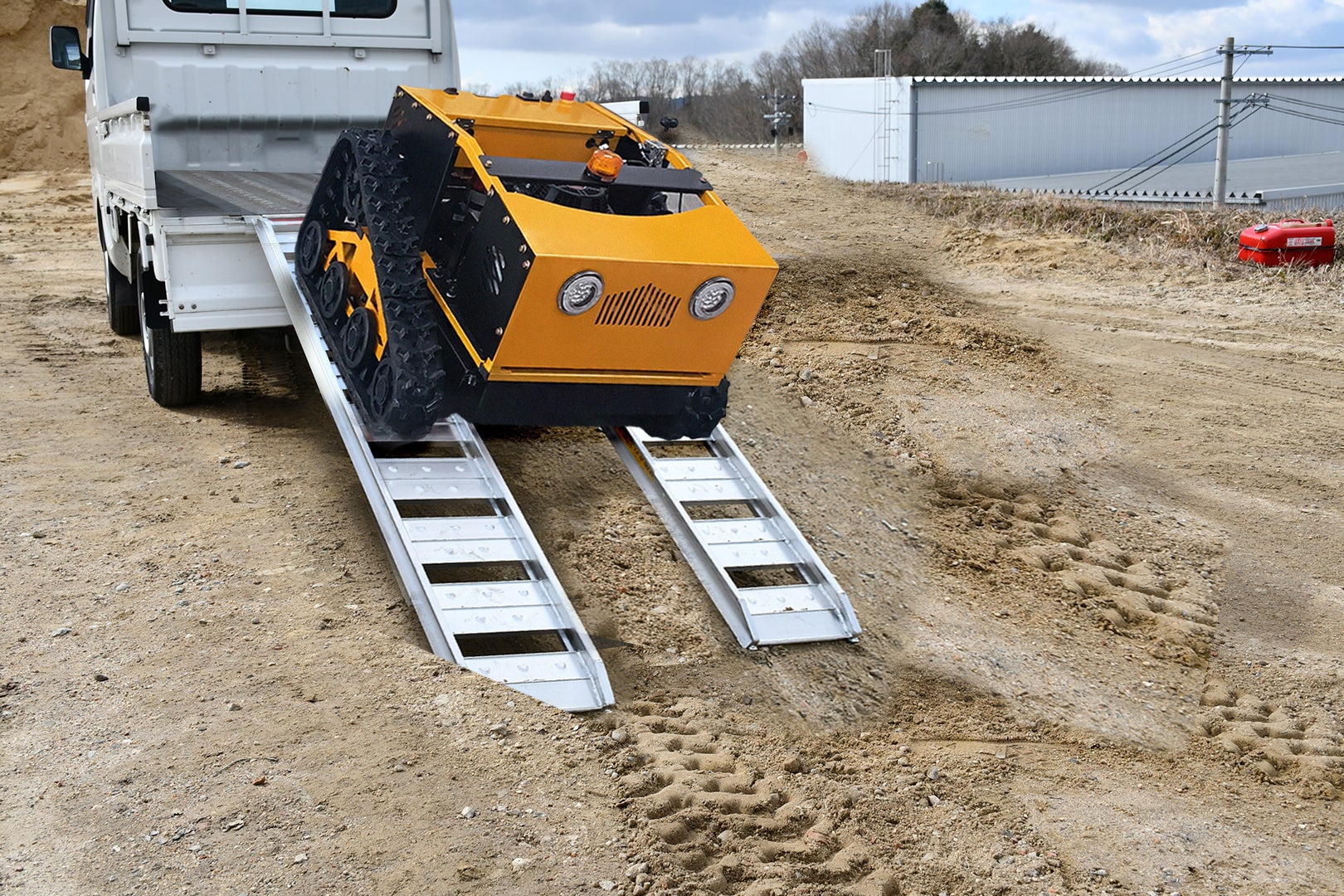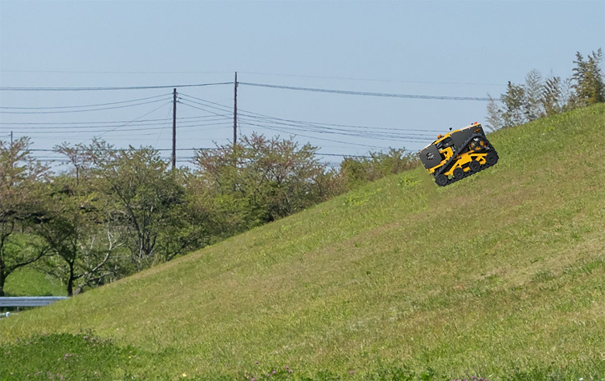 傾斜面でのグリップ力を発揮する16輪プーリー&キャタピラータイヤを装備しているので、法面や狭い圃場でも地面をしっかりとグリップし、滑り落ちることなく作業できます。軟弱地やソーラーパネル設置場所の下など、人が入って行きにくい場所でも楽に作業可能です。