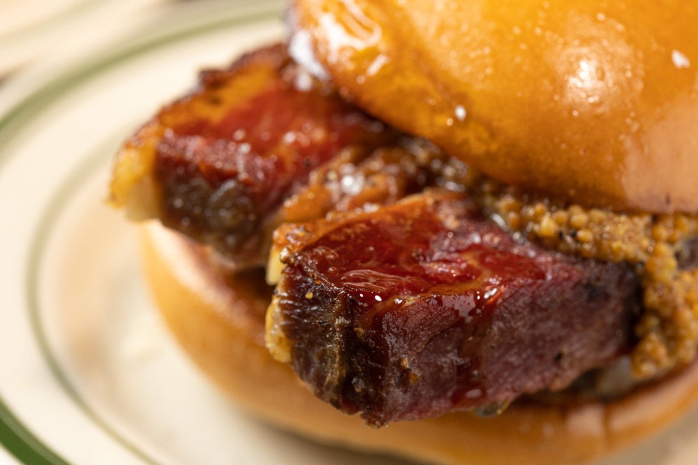 「お肉本来の味わいを感じて欲しい。」と語る塩田シェフの渾身の一品は、粗挽き肉の食べ応えが良く、喉の奥から鼻孔へと熟成肉のナッツにも似た甘い香りが広がります。1週間かけて仕込む「ほろほろ」の厚切りパストラミは、パリッとしたパンの中でじんわりと旨味がしみ出します。パストラミは牛バラ肉を4日間じっくりと塩でマリネし、柔らかくなるまで加熱調理を経て、さらにスモークし6日間かけて仕上げます。