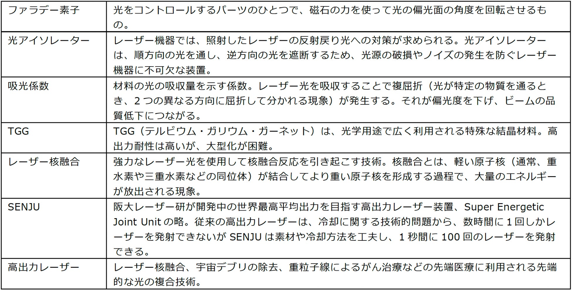 日本電気硝子株式会社(本社:滋賀県⼤津市 社⻑:岸本暁)、大阪大学レーザー科学研究所(以下、阪大レーザー研)、核融合科学研究所、京都大学は大型高出力レーザーのキーパーツとなる「ガラス製ファラデー素子」を開発しました。このパーツを用いた光アイソレーターにより、大型高出力レーザーの課題である反射戻り光を抑制できます。高出力レーザーは、レーザー核融合や宇宙デブリの除去、重粒子線によるがん治療など精密工学や先端レーザー制御が求められるさまざまな分野への応用が期待されています。