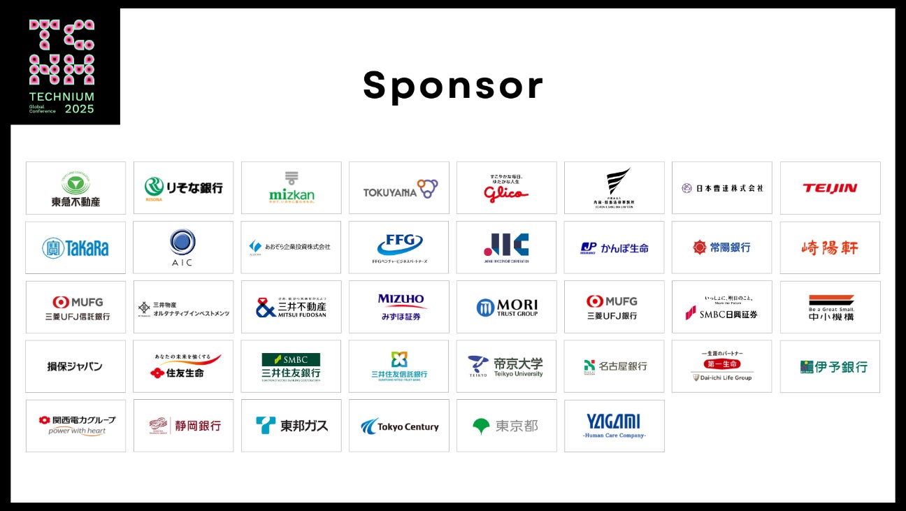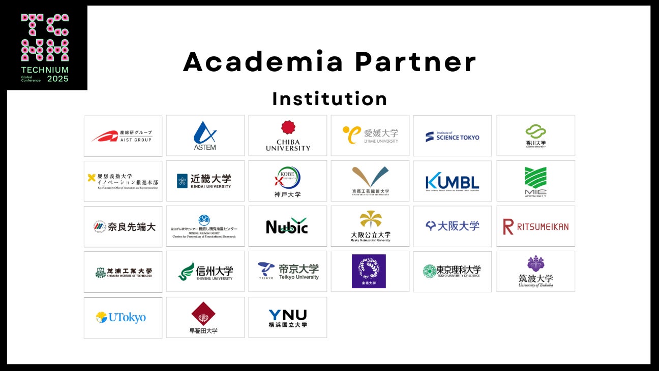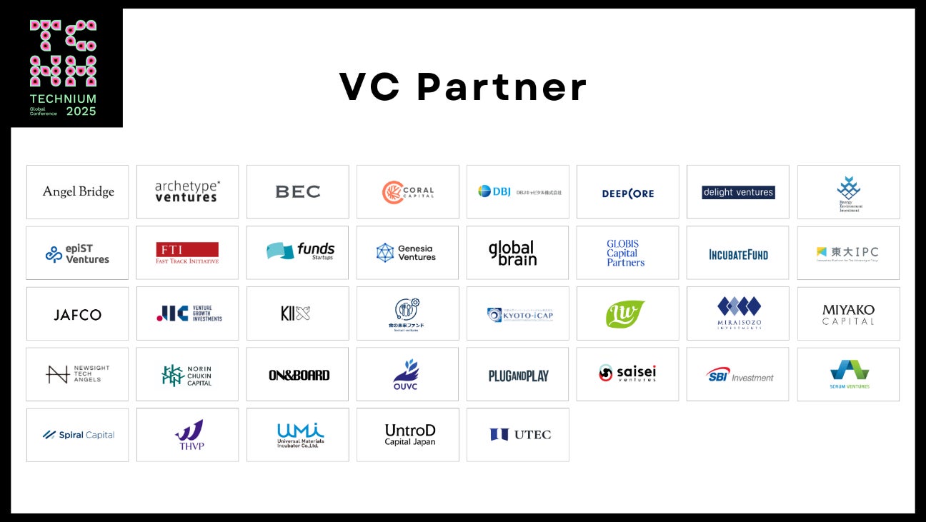 TECHNIUM Global Conferenceがテーマとしている革新的な研究とビジネスを結びつけ、最先端技術の社会実装を促進」考えに共感していただいた、スポンサー企業(38社)、VCパートナー(37社)、アカデミアパートナー(36団体)、メディア・ナレッジパートナー(9社)計120社・団体が参画いたします。