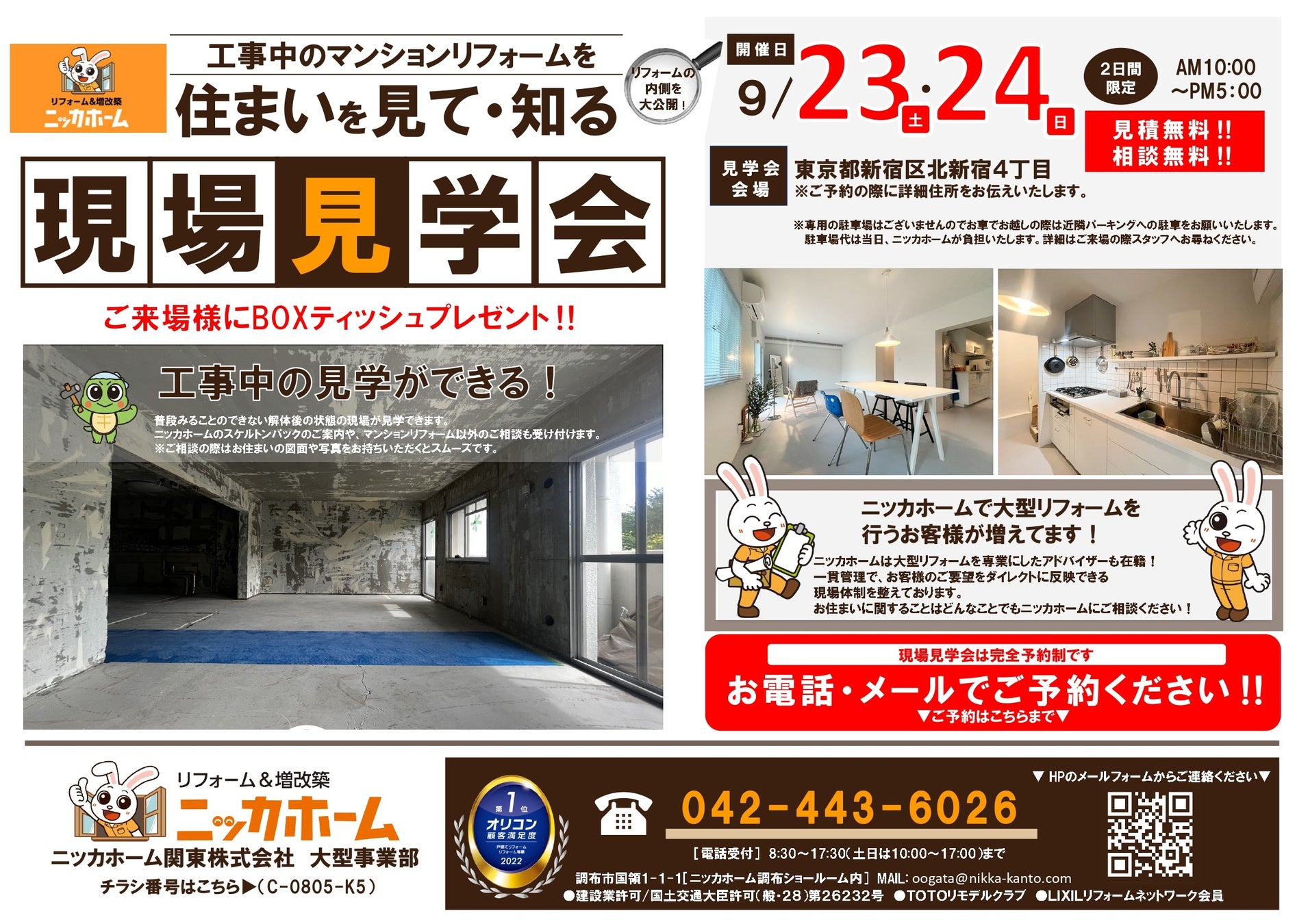 リフォーム&増改築でおなじみのニッカホームがマンションリフォームスケルトンパックの現場見学会を実施します!リフォーム工事中の見学ができる貴重な機会ですので、ご興味がございましたら是非お越しください!