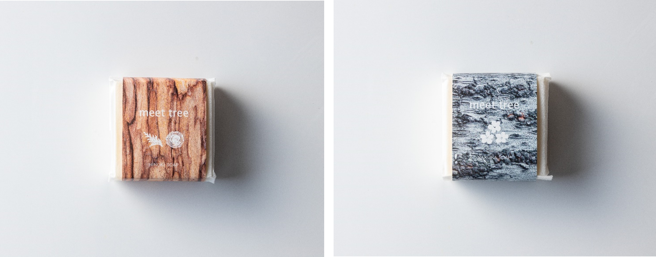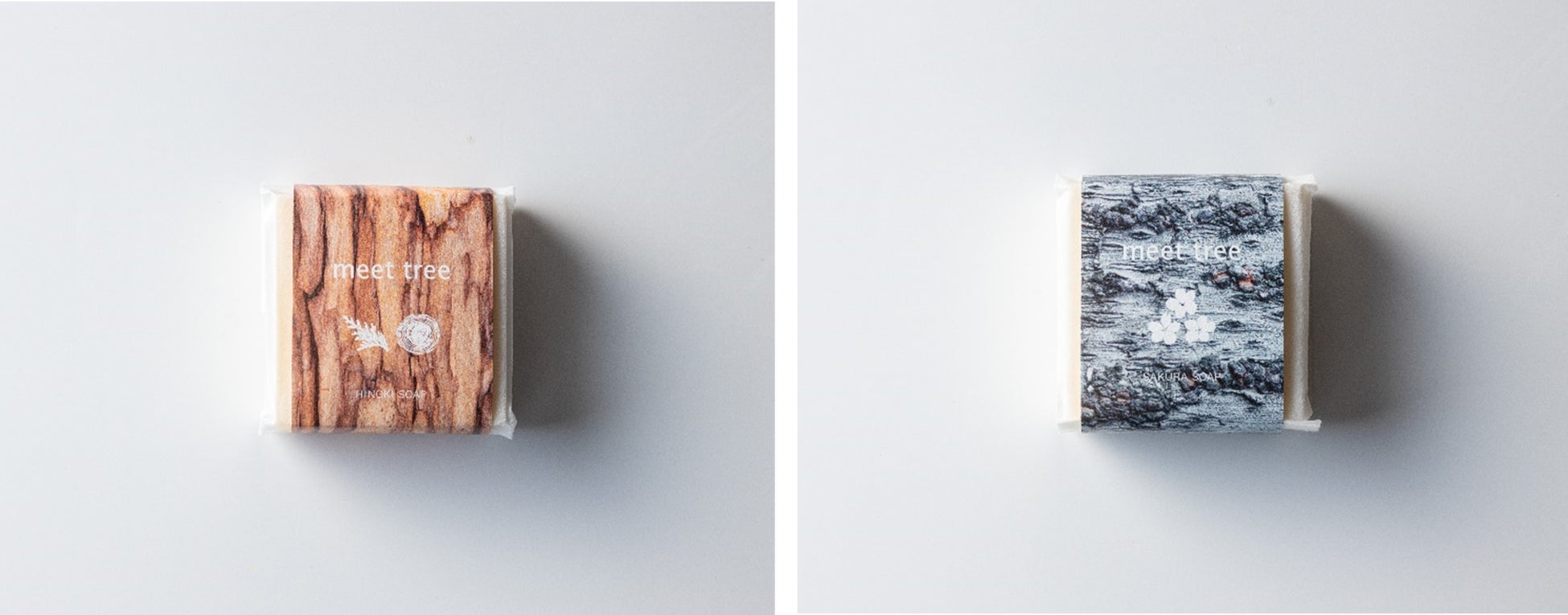 「MTハンドメイドソープH」はヒノキの葉と木の精油を配合し、まるで森林にいるような癒しを感じられます。「MTハンドメイドソープS」は、桜の香りをイメージしたブレンド精油で華やかな香りを楽しめます。それぞれヒノキの樹皮とサクラの樹皮をデザインしたパッケージで、より樹木の雰囲気を感じていただけます。