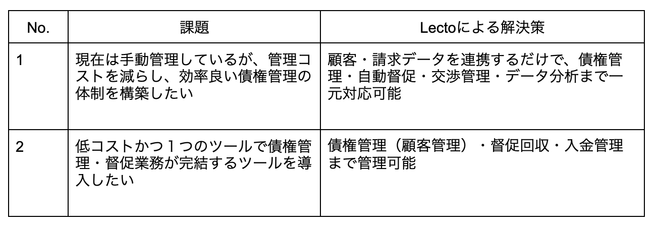 近年、主力としてきた太陽光・蓄電池サービスにおける顧客数の増加だけでなく、さまざまな分野へサービスを拡大していく中で今後の債権回収業務の負荷増加が見込まれることから、それらの業務を自動化および効率化するべく、債権管理(顧客管理)・回収からオフバランスまで一気通貫で構築可能な「Lectoプラットフォーム」を採用いただきました。